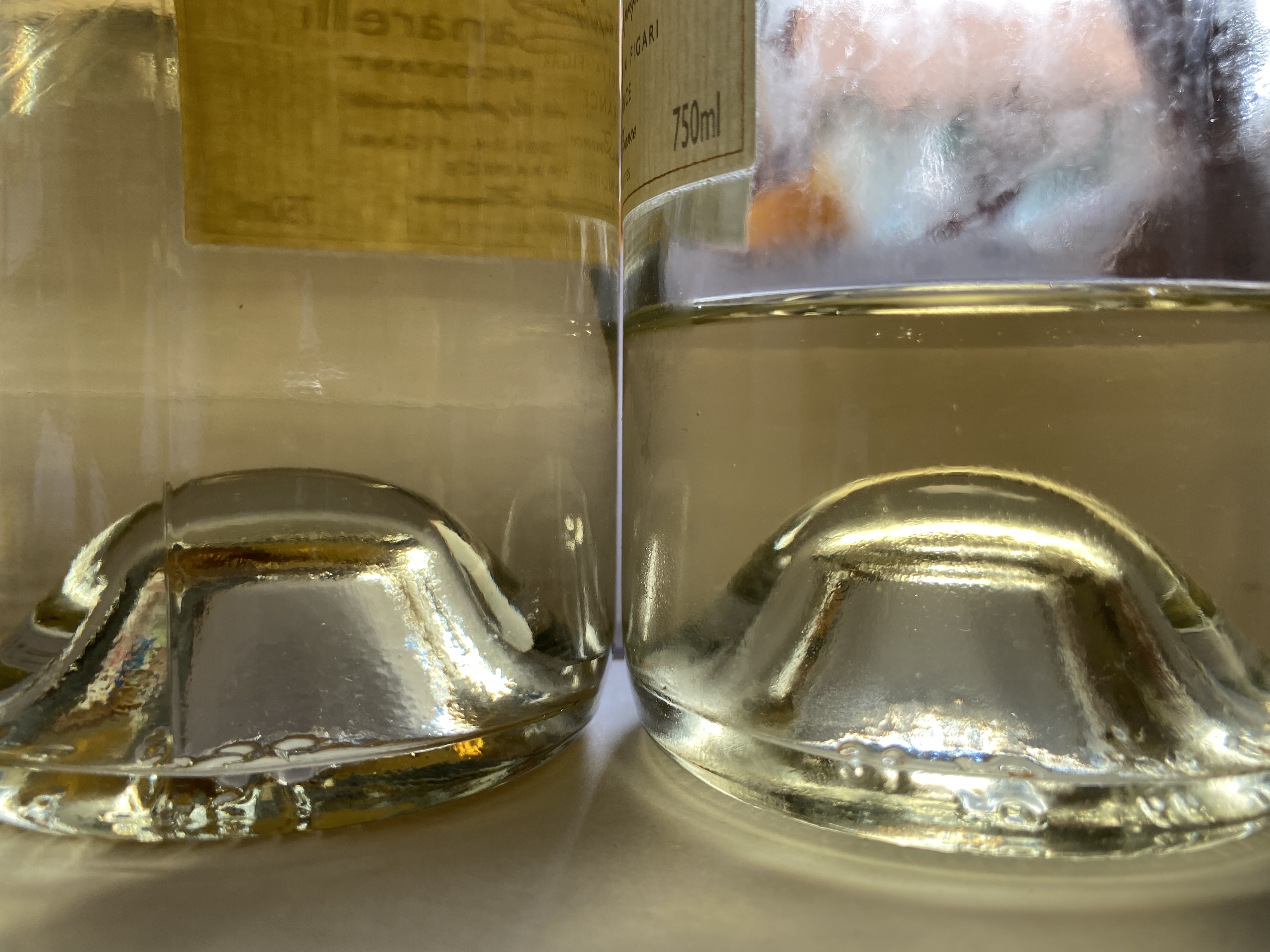 Die rechte Flasche sieht tatsächlich etwas oxidierter aus.