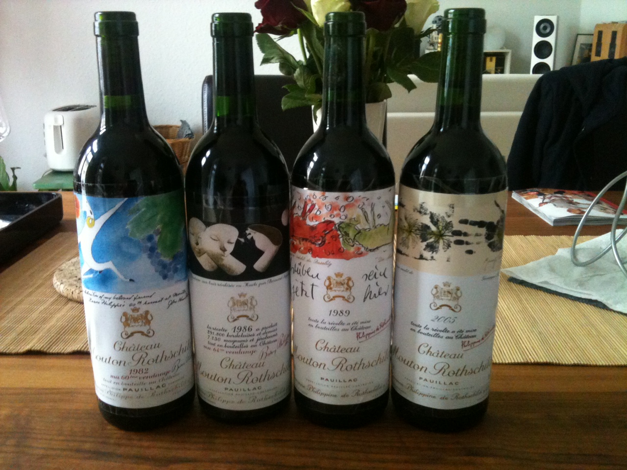 Tatsächlich handelte es sich um einen Phelan Segur 1998 (von mir 18 P.), um einen Leoville Barton 1995 (18 + P.), den wirklich großartigen Sociando Mallet 1990 (18-19 P.) sowie als WOTN unter der 82er-Mouton-Maske steckend Leoville Poyferre 1989 (19+ P. – der hatte mich vor drei Wochen bei unserer 1989/1990 Bx-Probe noch mehr begeistert und sich in meinen Augen als „perfekter“ Wein gezeigt). Letzterer kurz beschrieben: in der Nase Zimt-/pflaumenkompott, Cabernet-Paprika, Erdbeer-Sahne-Karamell. Am Gaumen laktisch, sehr komplex und harmonisch und im Glas immer weiter zulegend. Die Bewertungen fielen übrigens recht einheitlich aus, zumindest bzgl. der Rangfolge der Weine.
