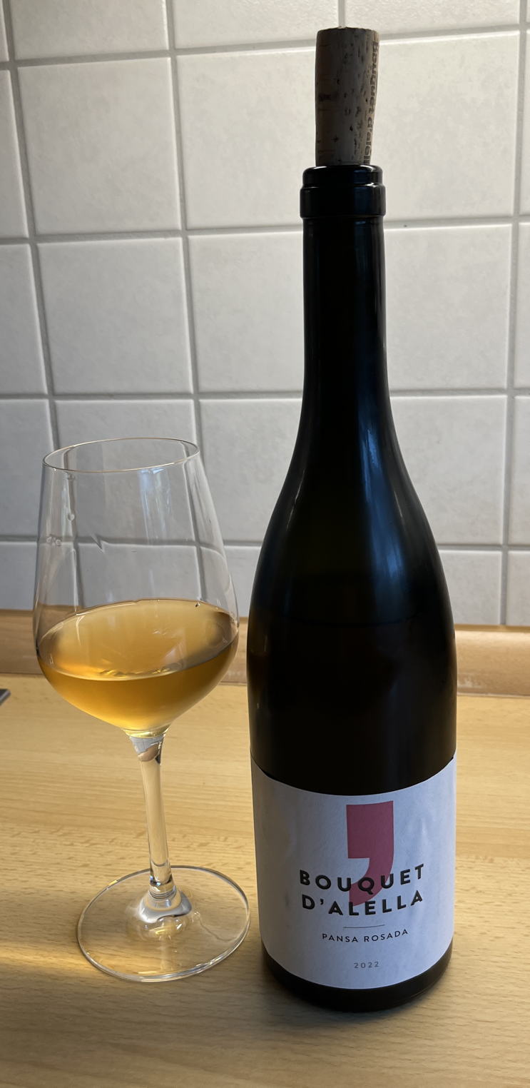 2022er Bouquet d'Alella Pansa Rosada, 11 % Alk., Restzucker 0,0 g/l, Säure 6,3 g/l (wenn ich die Tabelle, die mir das Weingut auf Nachfrage geschickt hat, richtig interpretiere....), D.O. Alella, Flasche 49 von 320