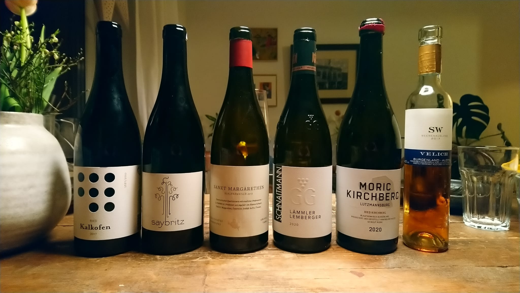 Gestern war ich auf einer kleinen Blaufränkisch Probe. Ziel der Probe war es die Rebsorte Blaufränkisch auf „Herz und Nieren“ zu prüfen. Dazu wurden recht spontan Weine zusammengestellt, die verfügbar waren und mich und zwei Freunde interessierten. Wir haben darauf geachtet, dass wir die drei Gebiete im Burgenland und einen schwäbischen Vertreter dabeihatten. Außerdem war der Anspruch da Spitzenerzeugnisse zu probieren. Es ging uns ausdrücklich nicht darum die gesamte Rebsorte Blaufränkisch mit einer Probe zu erschließen. Dazu war das Probenfeld natürlich viel zu klein. Trotzdem konnten wir viele Erkenntnisse gewinnen beim Trinken von: