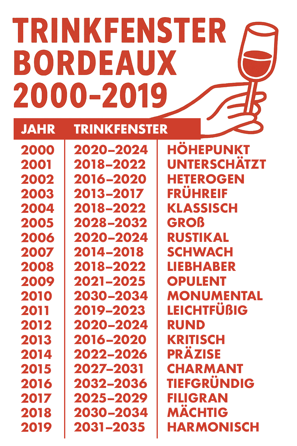 Ich habe mir mithilfe von KI ein übersichtliches Trinkfenster-Schema für Bordeaux-Jahrgänge ab 2000 erstellen lassen – als kleine Orientierungshilfe für den eigenen Keller. Die Basis waren keine bloßen Kritikerprognosen, sondern vor allem aktuelle Verkostungsnotizen und Erfahrungsberichte aus Foren wie WineBerserkers, CellarTracker und Bordoverview, ergänzt durch gängige Jahrgangsanalysen. So entstand ein Mittelwert für das jeweils optimale 5-Jahres-Trinkfenster der meisten Weine im Bereich 50–150 €.