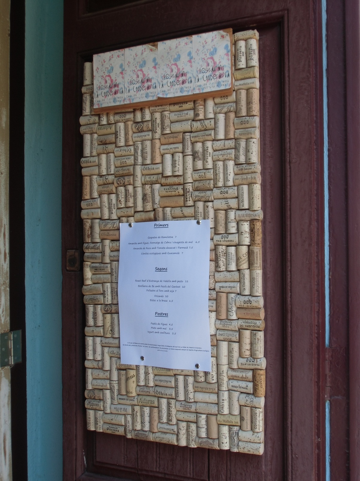 es ging weiter zu einem der nächsten höhepunkte der priorat-reise - dem mittagessen im kultrestaurant "la cooperativa" in porrera. das restaurant ist wie gemacht für einen weinfreak. die hauptdeko des ladens besteht aus ausgetrunkenen prioratflaschen - da ist wirklich alles dabei was rang und namen hat, farbenfroh aussieht oder sonst etwas hergibt. hinten in der ecke steht eine clos erasmus flasche, dort ein clos mogador und dort ein l'ermita - der "hochadel" des priorats also. da spürt man gleich, in diesem laden wurde schon viel spass gehabt...