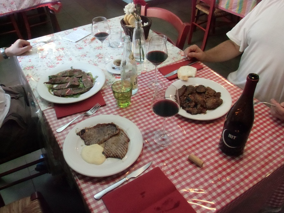 wir bestellen ein leckeres drei-gänge-menue, dann gings es nur noch um den wein dazu. und jetzt kams, da schlägt torsten doch einen meiner lieblingsweine vor, den nit de nin, und der war auch gar nicht so teuer - fast schon billiger als beim händler in deutschland (bzw. deutlich billiger!). da war die wahl schnell gemacht - der kellner und inhaber kam dann zwar und wollte eine kleine weinberatung machen, aber als torsten in angrinste und sagte wir wüssten schon sagte der kellner gleich: "na bestimmt einen nit de nin" und verdrehte lachend die augen :-) (muss torsten hier wohl schon öfter geordert haben).