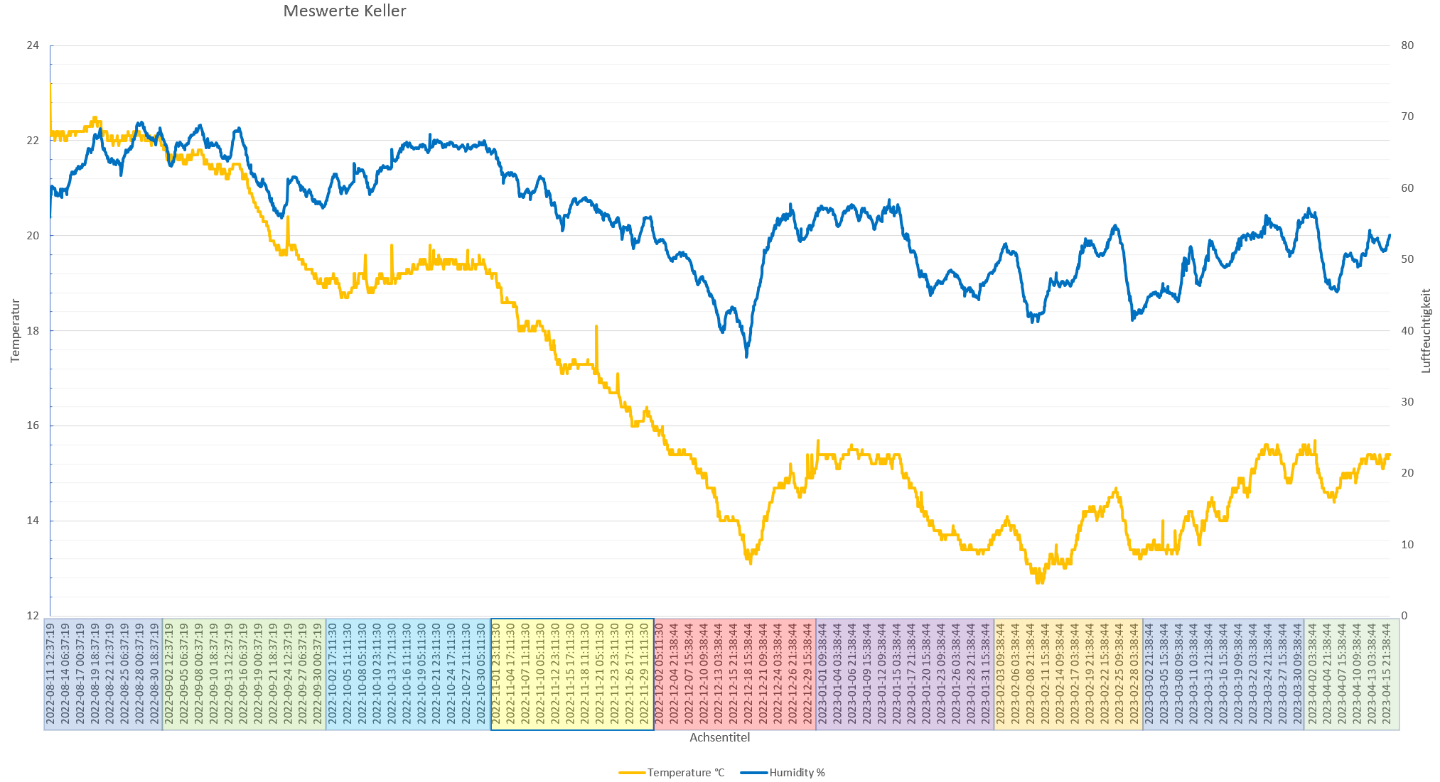 Wie im ersten Beitrag wurde alle 2h ein Messwertepaar (Feuchte /Temperatur) aufgezeichnet, wobei ich die Feuchte wirklich nicht besonders spannend finde.