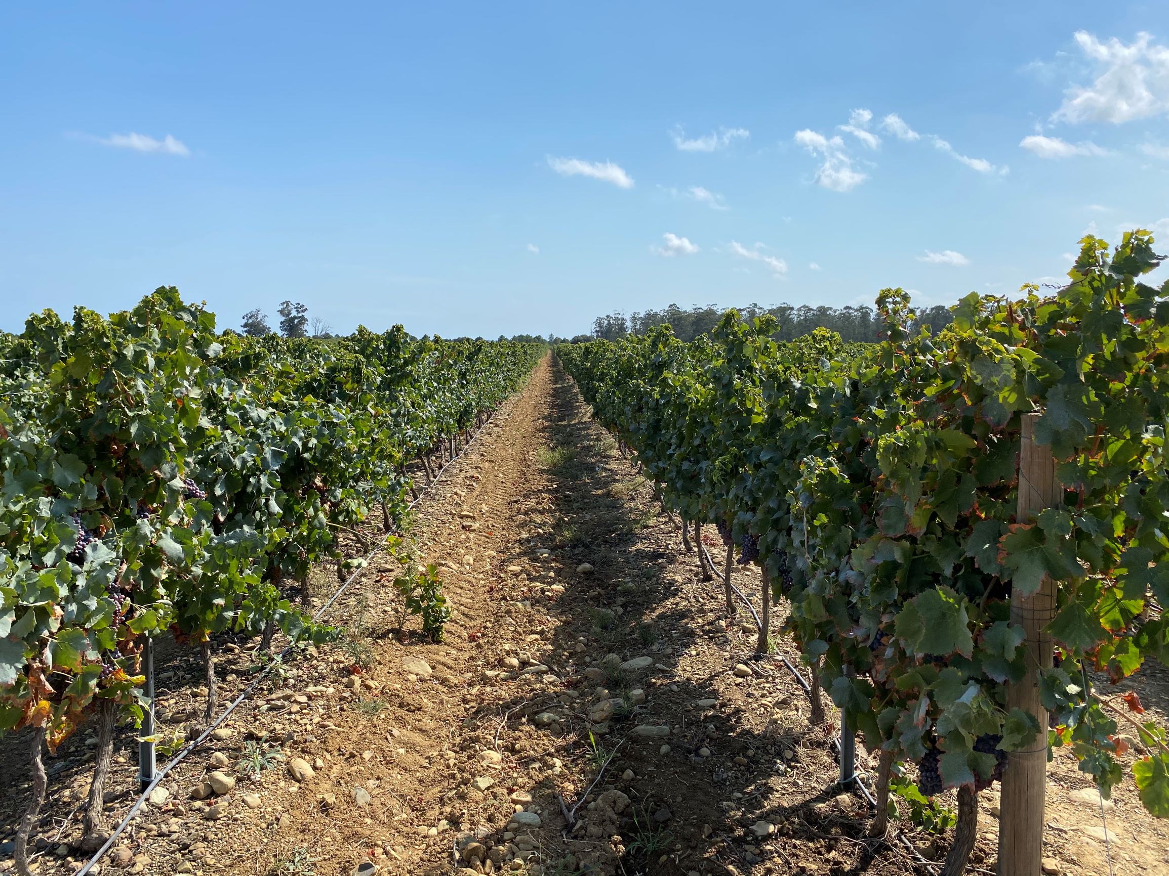 Hier wird nicht bewässert, die Reben sehen nach meiner laienhaften Einschätzung recht ungestresst, gesund aus. Ich vermute, es gibt hier verfügbares Grundwasser. Unweit liegt der Etang de Diane und seine speisenden Wasserläufe.