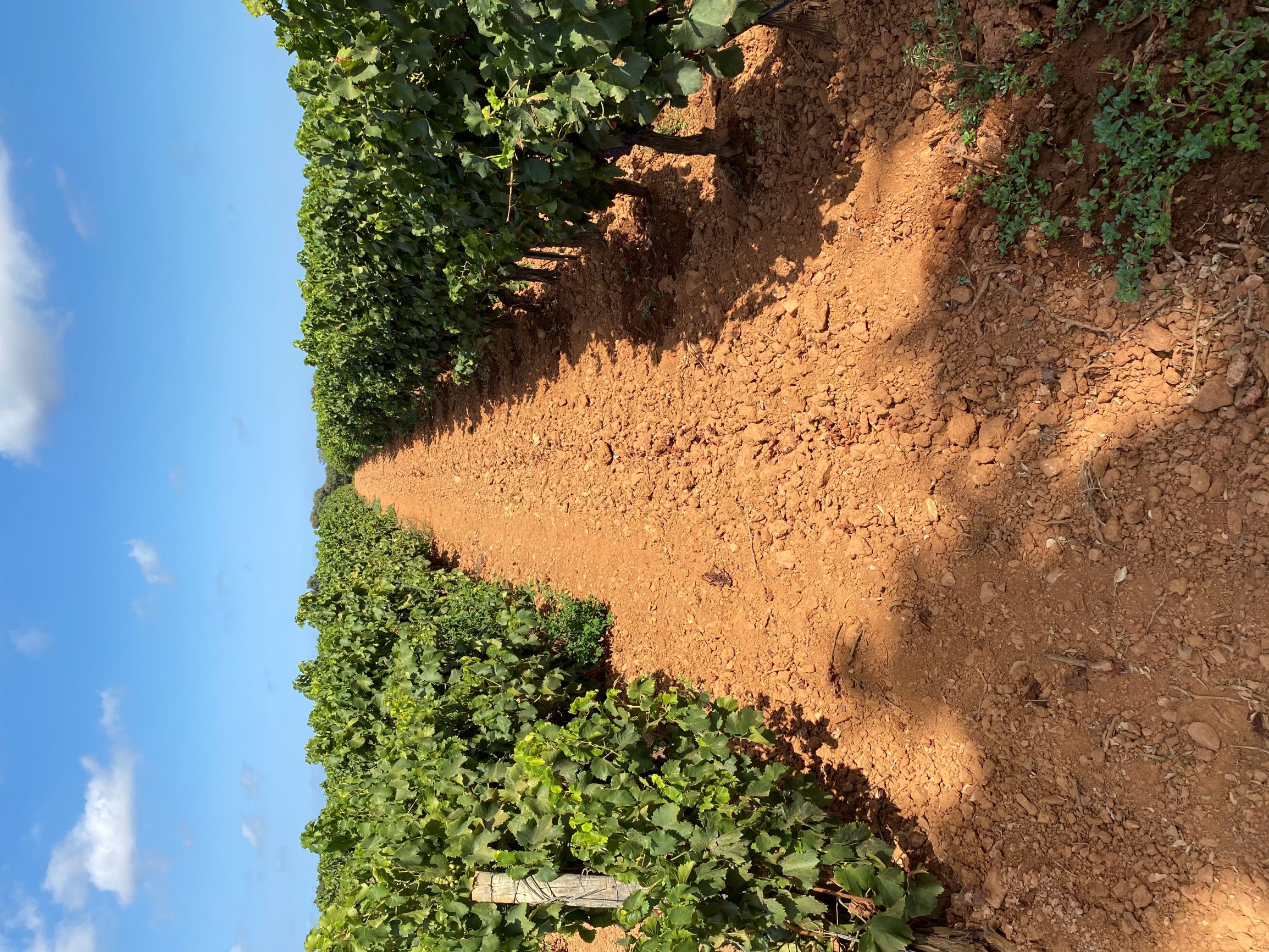 Man kann sehen, dass es hier kein Flussgestein im Boden gibt. Es handelt es sich hier nicht um Schwemmlandböden, sondern tonhaltige Braunerdeböden aus dem Miozän. Was ich erst mal ganz interessant fand, dass die Böden von Clos Poggiale/Terra Vecchia schlagartig röter sind. Das kann natürlich ein rein optischer Effekt sein, z.B. durch die Partikelgröße in Abhängigkeit von der Bodenbearbeitung. Aber ich kann mir auch vorstellen, dass die Verwitterung der Böden hier durch die intensive Bewirtschaftung der Weingärtner (Menge der Bewässerung, Häufigkeit von Bodenbearbeitung) unterschiedlich vorangeschritten ist. Das macht sich dann anscheinend in einer stärkeren Verbraunung (also Freisetzung von Eisenionen und damit Rotfärbung) bemerkbar.