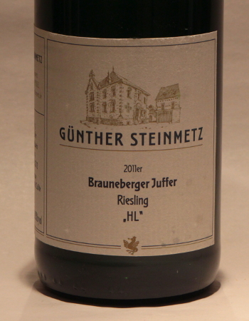 Der beste Riesling, um mir die Traube nahe zu bringen, kam von der Mosel, vom Betrieb Günther Steinmetz, der Wintricher Geierslay 2011. Der Wein lag lange auf der Hefe (sur lie) und ziegte sehr schön die Trauben, aus denen er hergestellt worden war, den Reifetstand, den Boden, das Gehölz, das Umfeld und die genaue Arbeit des Winzers.