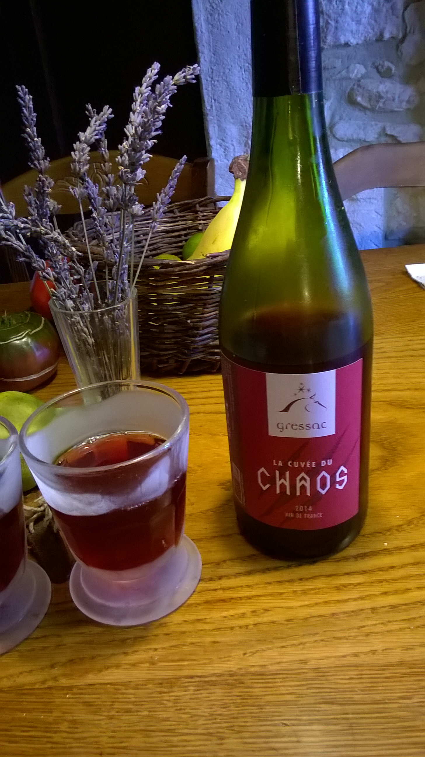 Ich eröffne mal ein Thema für die mannigfaltigen Weine der südlichen Rhône aus weniger bekannten Appellationen. Den Anfang mache ich mit dem folgenden Wein: Cuvée du Chaos von Dom. de Gressac. Eine Cuvée aus den Resttrauben eines Hagelschadens. Dementsprechend der Name, alles einfach abgepresst, wenig Mazeration, daher wenig Tannine und Farbe, eher ein dunkler Rosé. Kalt recht lecker bei den hier herrschenden Temperaturen.