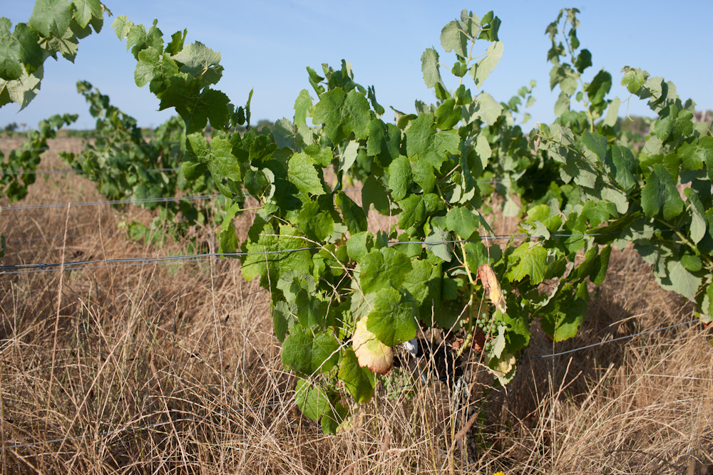 Die Aufnahme hier zeigt 11 Jahre alte Petit Verdot Reben einer Kieslage mit deutlichen Trockenstresssymptomen.