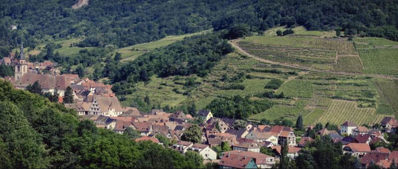 Die GC Lage Schoenenbourg hinter dem Mittelalter-Dorf Riquewihr.