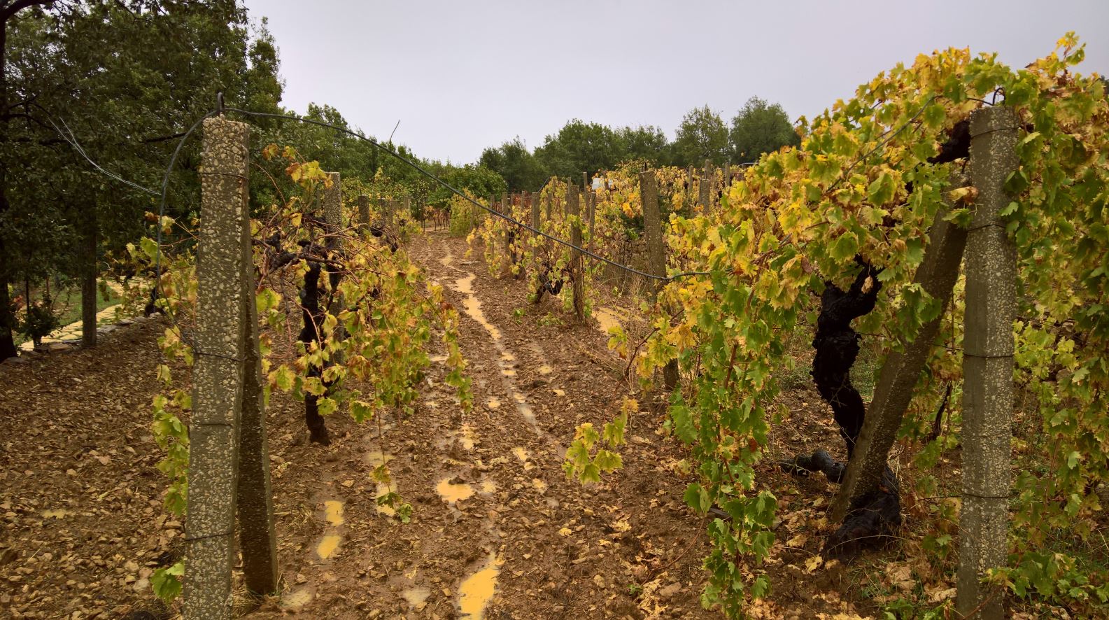 Ich habe das Bild gewählt, weil man hier ganz gut sehen kann, dass der Boden hier, im Vergleich zu Château Belle Vue, lehmhaltiger ist und besser das Wasser speichern kann. Das führt nach Angaben von Sarmad Salibi dazu, dass seine Reben im Sommer weniger Trockenstress erleiden. Wie man sehen kann, hatte es mittlerweile angefangen in Strömen zu regnen.