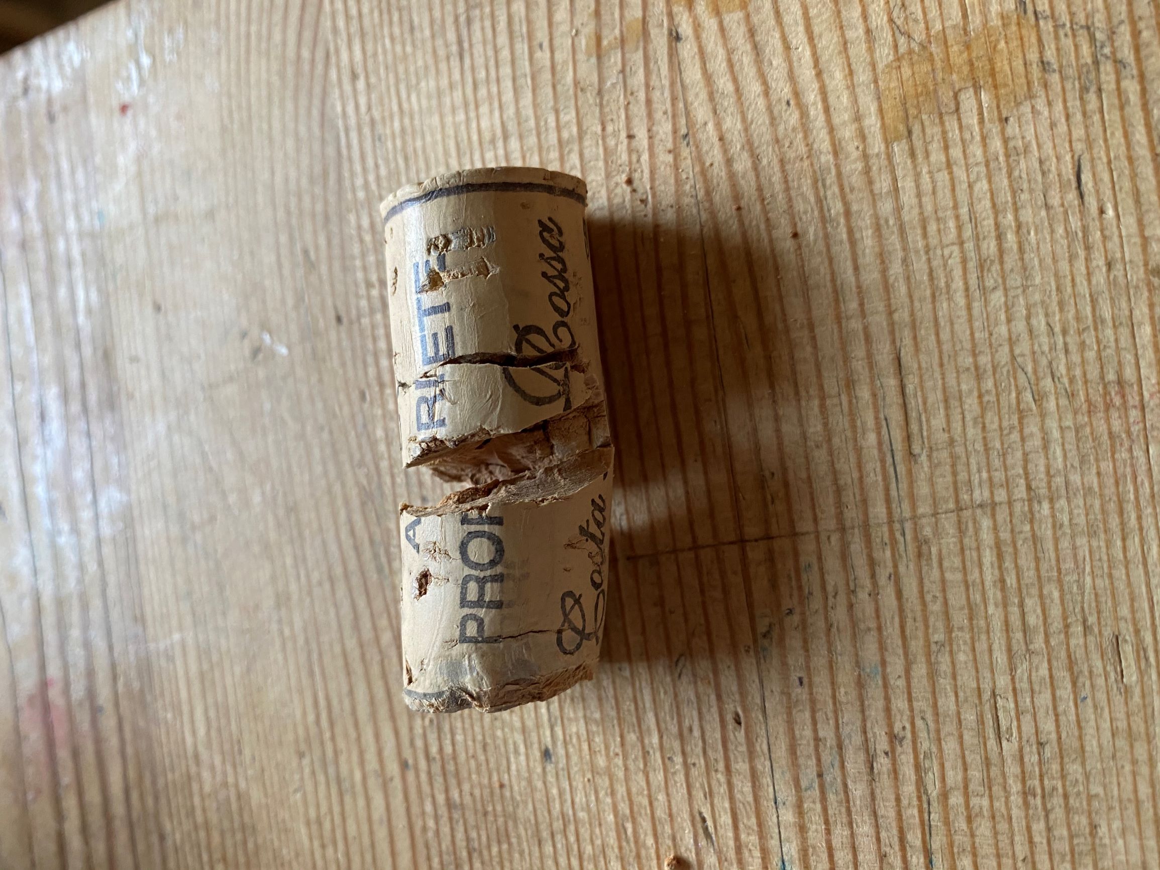Damals hatte ich in Summe drei Flaschen angepiekst, statistisch also eine 2/3 Chance, dass der Sauerstoff schon aus dem Coravin heraus war; ob es aber die erste Flasche war, weiß ich natürlich nicht mehr. Ich hatte in diesem Fall die fortgeschrittene Reife auf den wohl eher ungeeigneten Korken für Coravin geschoben. Auf der Unterseite sieht man das nicht geschlossene Einstichloch, der Korken ist mir dann auch im Laufe des Abends gerissen; aber nicht beim Öffnen, sondern als ich ihn zurück in die Flasche stecken wollte.