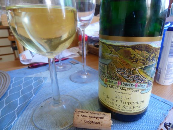 Das verwundert mich kein bisschen, denn ich have die Merkelbachs besucht und über sie ein Porträt geschrieben (http://www.captaincork.com/merkelbach-l ... ar-besteht). Das war ein großes Erlebnis, auch wenn ich den moselfränkischen Dialekt der Herren größtenteils nicht verstanden habe – macht aber nichts; gehört aber gewissermaßen zum Terroir. Das Interesse jedenfalls ist geblieben, und darum habe ich mir die 2017er Spätlese aus dem Erdener Treppchen vorgenommen. Und da soll noch mal jemand sagen, die alte osel sei das pure Zuckerwasser gewesen. Doch nicht mit den Merkelbachs. Wie Riesling geht, haben diese zwei Senioren doch eh in den Genen! Also ist ihr Treppchen hat, kaum dass es den Mundraum geflutet, zuerst einmal eines: würzig to the max. Ist halt ein Riesling.
