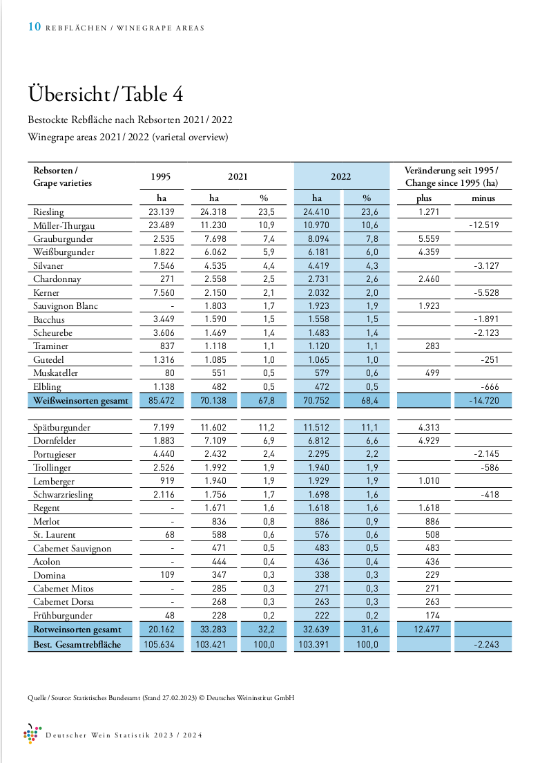 Ich verfolge mit Interesse die jährliche Statistik des Deutschen Weininstituts DWI. Der Ausschnitt aus der aktuellen Statistik 2022/2023 zeigt die: