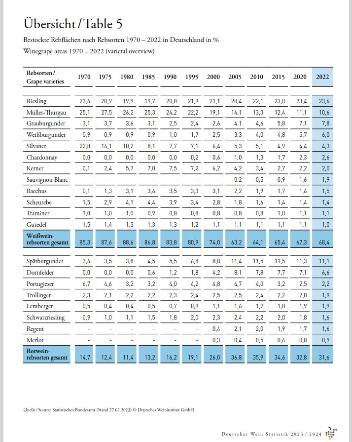 Insbesondere halte ich die Übersicht "Bestockte Rebflächen nach Rebsorten 1970 – 2022 in Deutschland in %" für interessant.