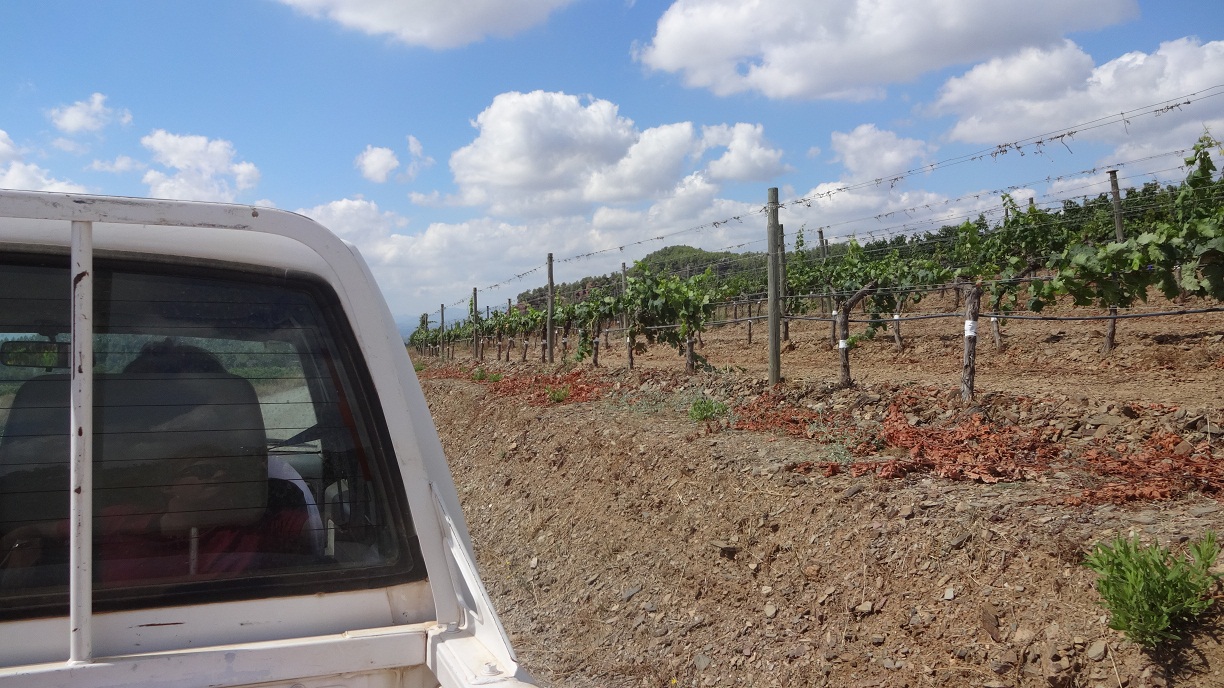 dann ging es mit pickup truck in die weinberge von mas d'en gil. zuerst in den macabeu weinberg (http://de.wikipedia.org/wiki/Macabeo). besonders interessant war die rote farbe des bodens - also eher nicht der schwarze licorella schiefer des priorats.