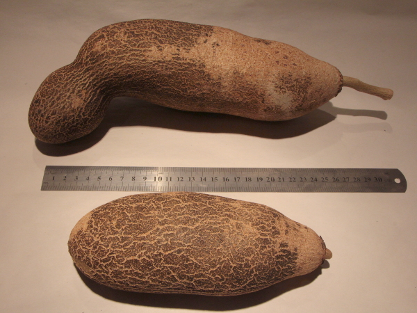 Zunächst dachte ich an Kalebasse, aber die Bäume sind ganz anders und die Früchte grün/braun und nicht hölzern. Vermutlich sind die Kalebassen-Früchte auch leichter und nicht schwer und hart wie Holz.