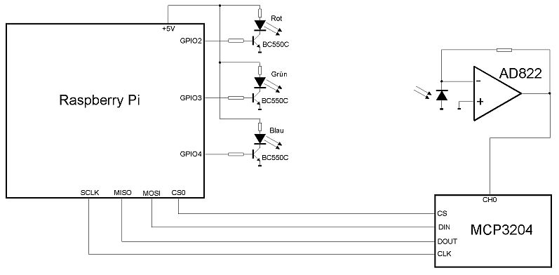 Ich würde das Projekt in etwa folgendermaßen realisieren (siehe Schaltbild): die verschiedenen Leuchtdioden (z.B. rot, grün und blau) werden einzeln über entsprechende Digitalausgänge ein- oder ausgeschaltet. Auf der anderen Seite befindet sich unsere Fotodiode, deren Strom (sehr gering, aber proportional zur einfallenden Lichtstärke) durch einen Operationsverstärker in ein passendes Spannungssignal verstärkt und von einem Analog-Digital-Wandler (hier: MCP3204 - 12 bit, SPI-Interface) in ein serielles Signal umgewandelt wird, das wir dann direkt über die entsprechenden Eingänge des Raspberry Pi einlesen können.
