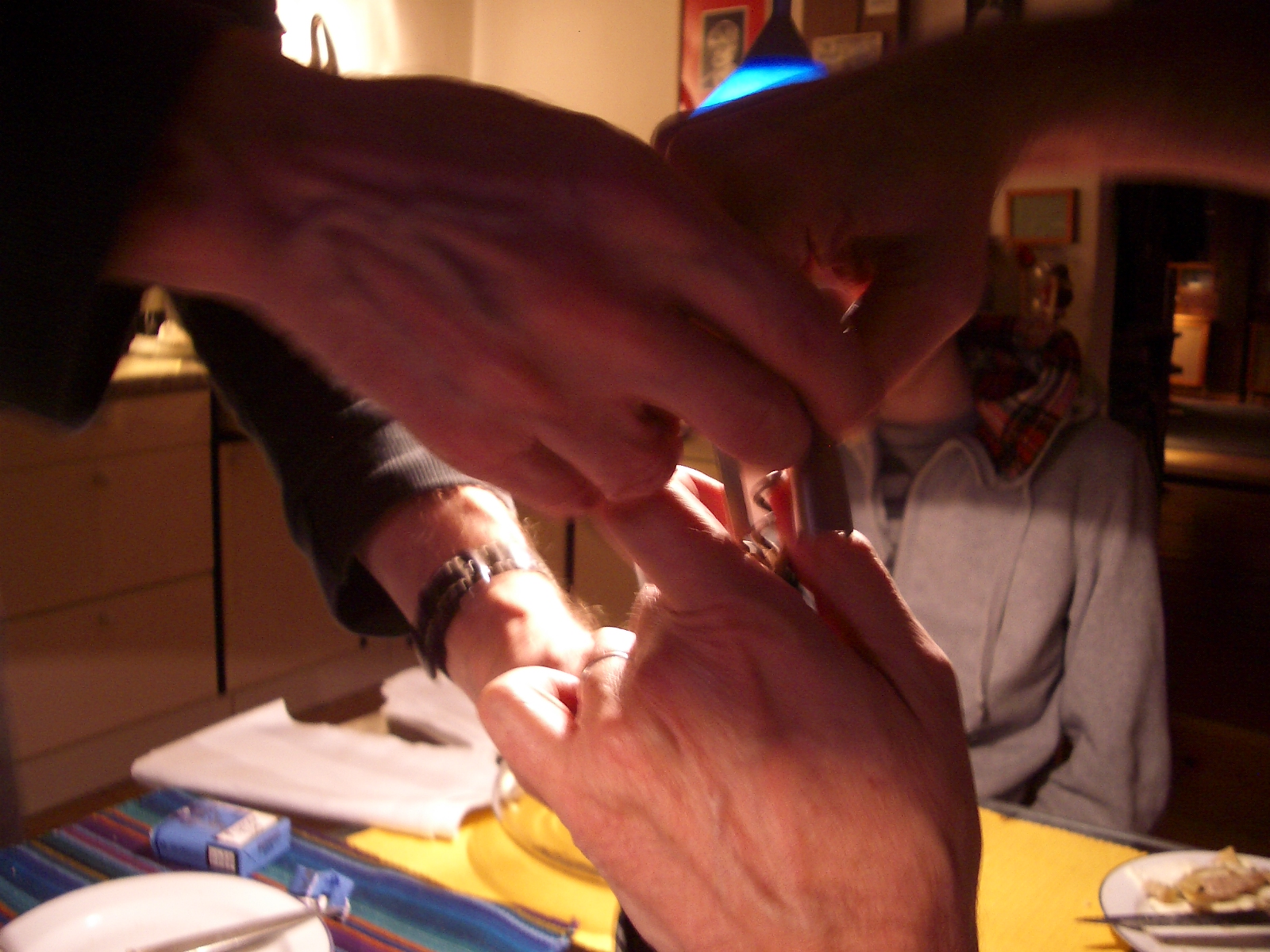Man sieht doch sofort, dass es sich dahier um kein "Rumwuseln" (igitt) handelt sondern um ... also der im Hintergrund, der graubehemdete, der hat Physik in der Schule und wird mal Forscher oder "Playboy" (Henscheid). Und der hat susa verraten: man bohrt zwei Kzieher wie folgt in den Korken: