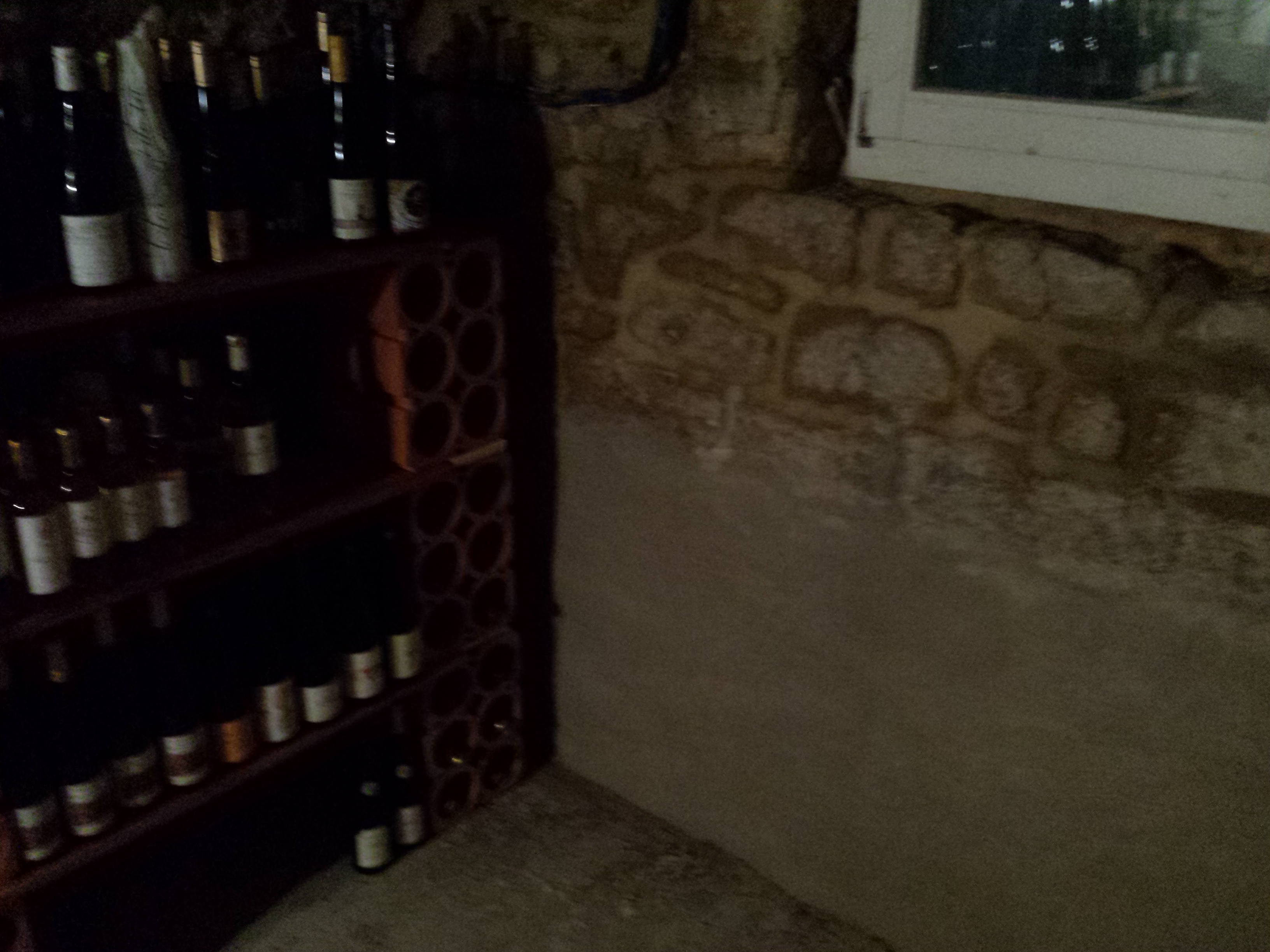 Wie man sieht ist es ein Naturstein-Gewölbekeller alter, pfälzischer Bauart (vermutlich ca. 100 Jahre alt). Die unteren Außenwände sind gerade im unteren Bereich feucht, bei Starkregen z.T. Auch tropfnass. Das dürfte besser werden, wenn wir dereinst die Terrasse drainieren.