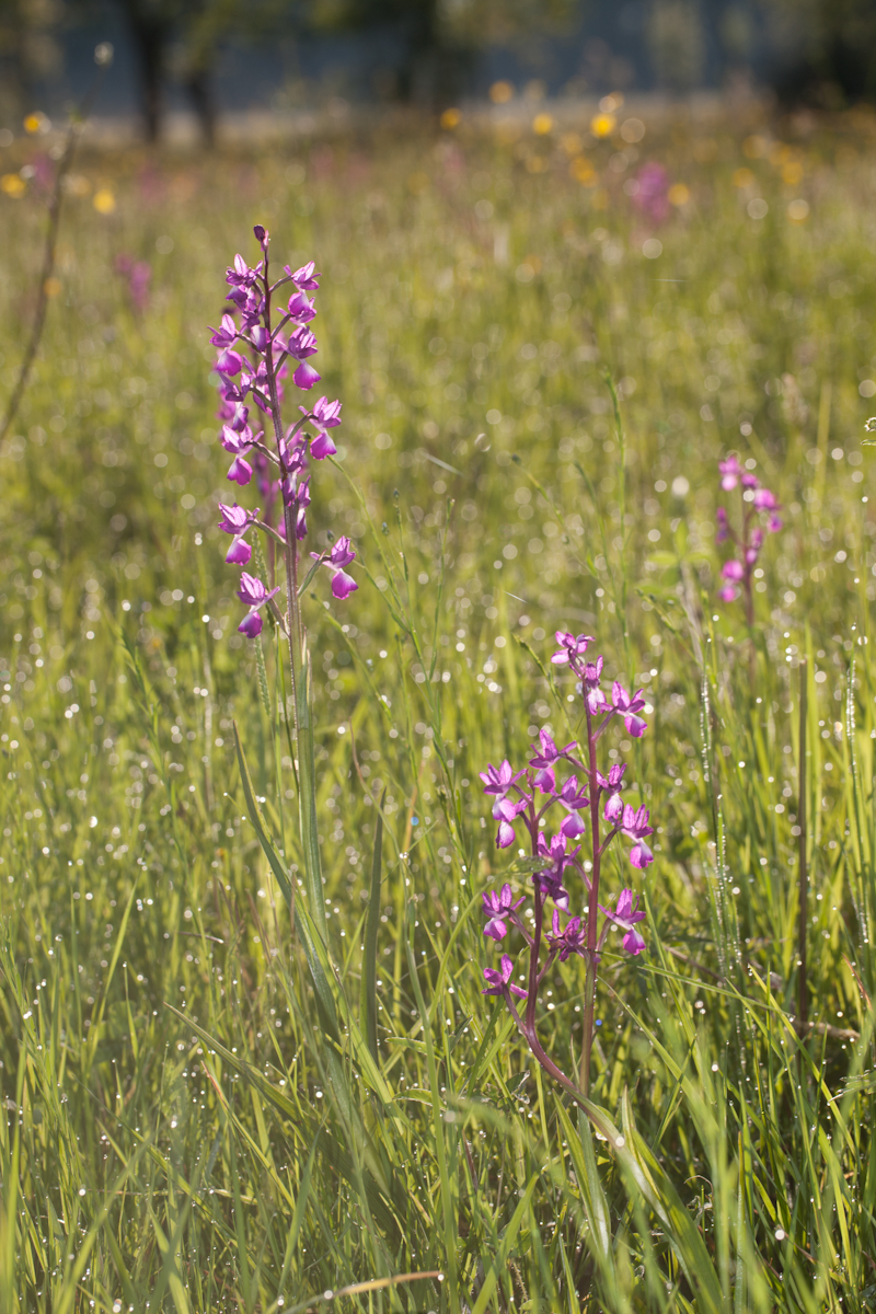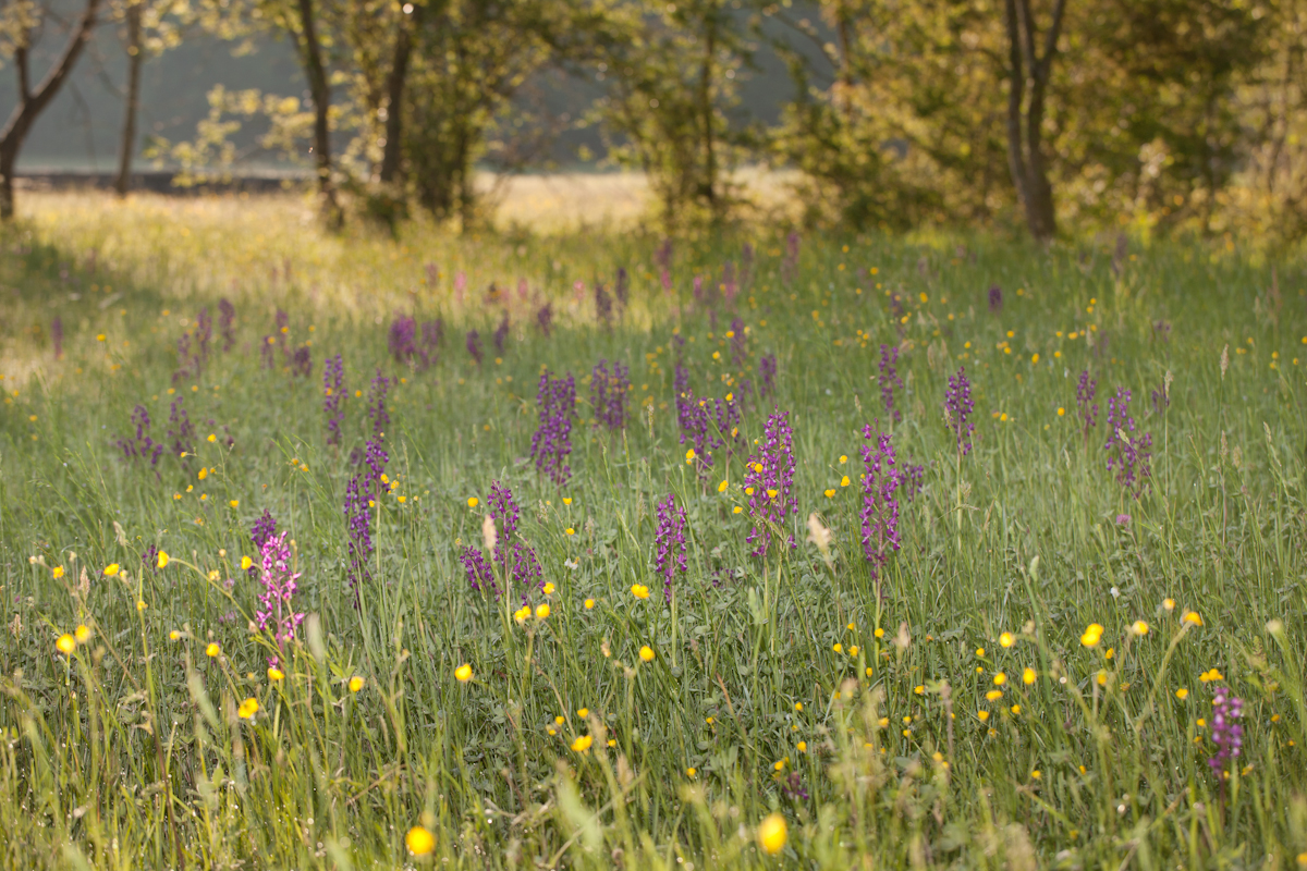 Es ist schwer zu vermitteln wie es mir ergeht, wenn ich morgens mal auf den Wiesen bin. Zwischen den weidenden Kühen spazierte ein Storch. Nachdem ich Heu gegeben habe schaute ich mir die Sommerwiese an. Auf den Sommerwiesen blühen gerade viele Orchideen, besonders zahlreich und auffällig ist das Lockerblütige Knabenkraut. Wegen der Wintertrockenheit sind viele Pflanzen kleinwüchsiger. Es ist einfach nur schön und lässt einem das Tagesgeschehen vergessen. Der Garten Eden kann kaum schöner sein.