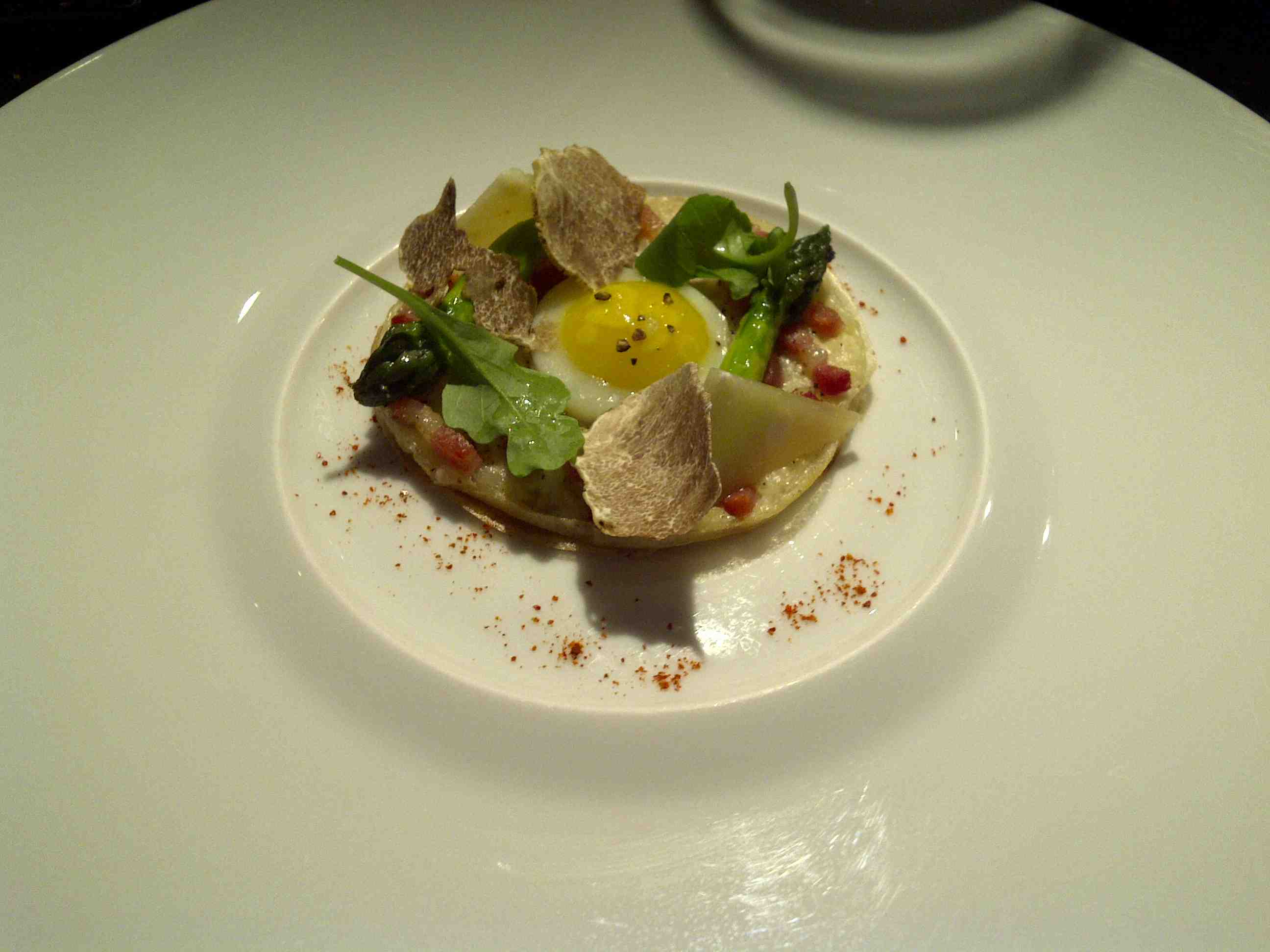 White onion tart with smoked bacon, quail egg "mirror" and green asparagus