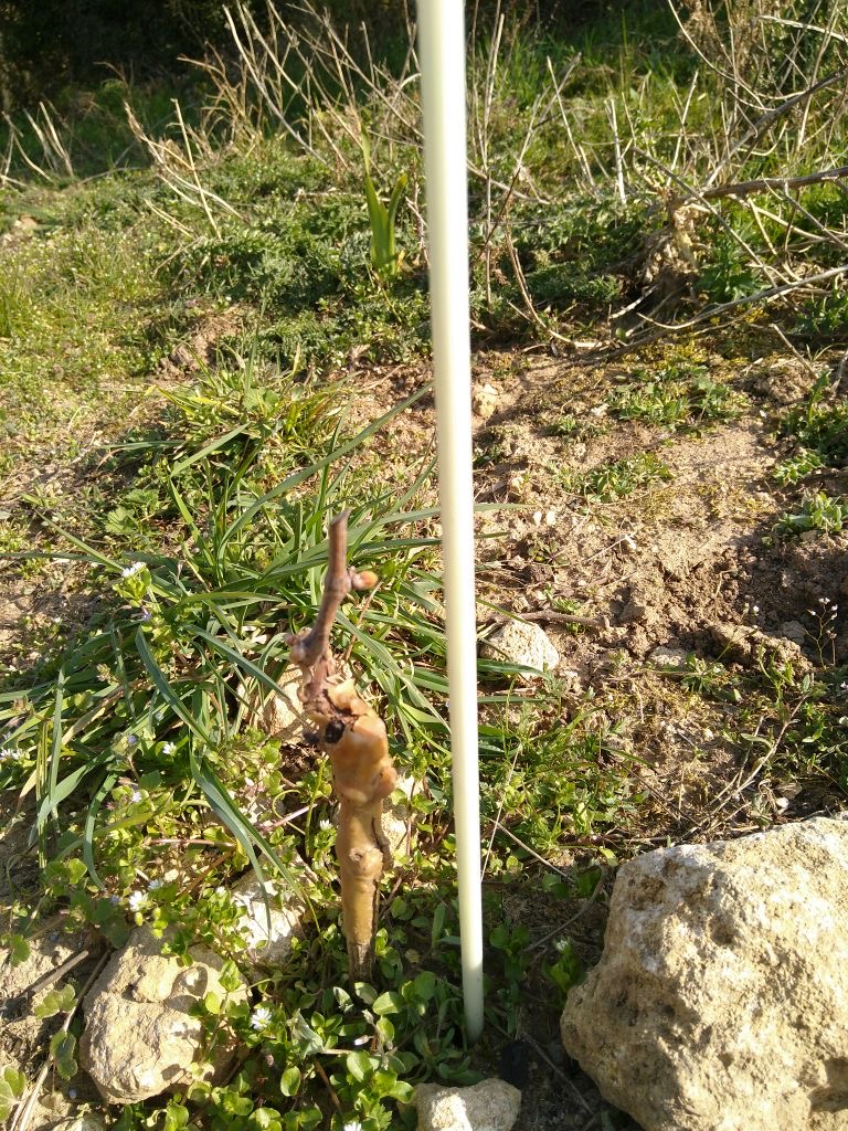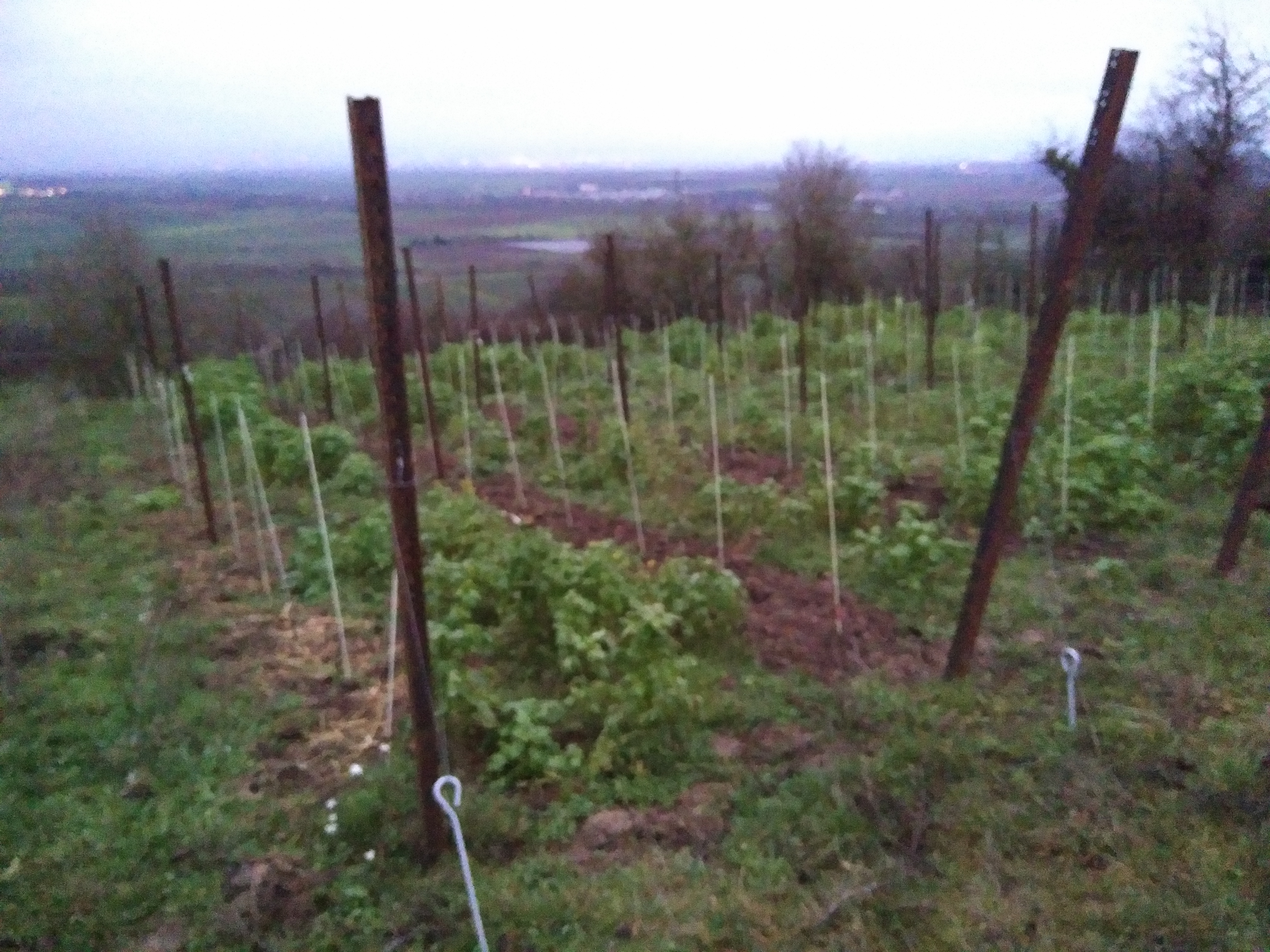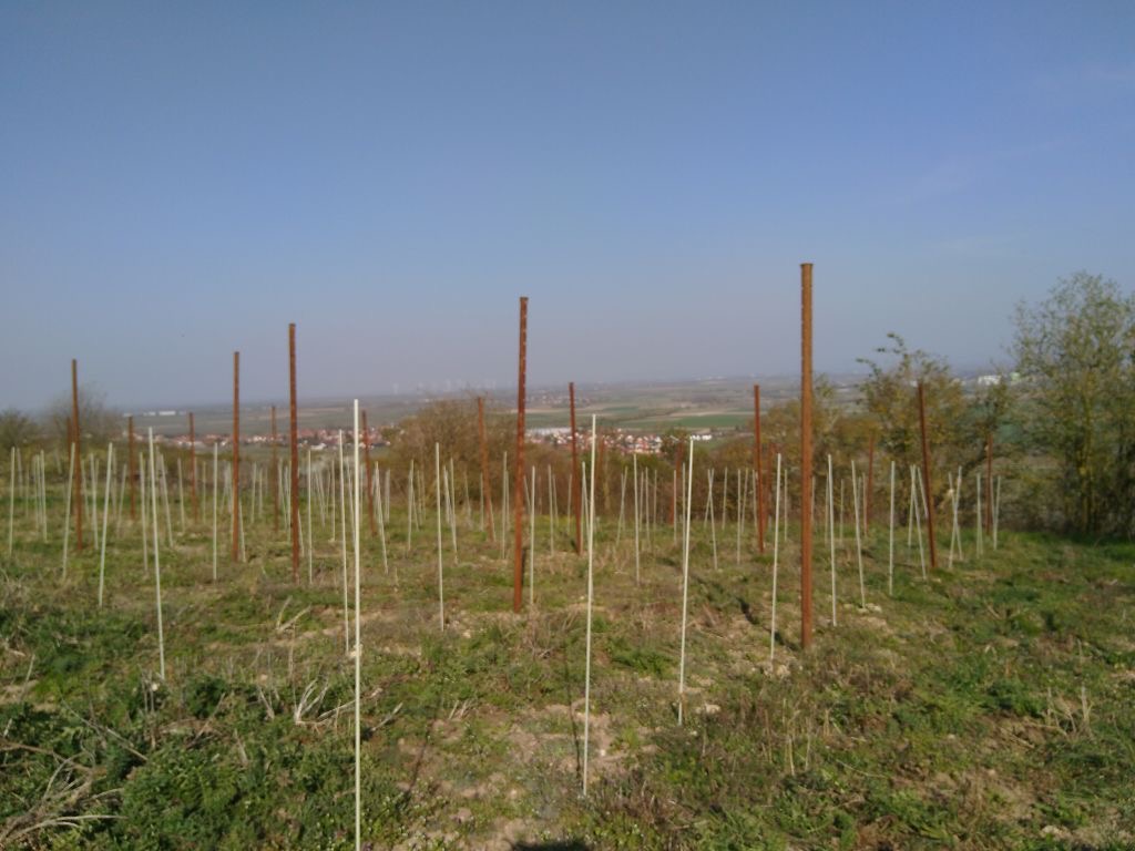 mittlerweile steht Jahr 3 des Weinbergs vor der Tür. Und es wird nicht einfacher. er letzte Sommer war v.a. im Juni und August zu trocken. Die Summer der Niederschläge war zwar nur leicht niedriger als im langjährigen Mittel, allerdings kam das Wasser nur als Getröpfelt runter d.h. nur die oberen Zentimeter des Boden wurden angefeuchtet. Eine richtigen Guss mit >10 Litern je Quadratmeter gäbe es quasi garnicht. Und das fanden die ansonsten gut angewachsenen Reben ab August nicht mehr lustig. Ihr Unmut äußerte sich in Wachstumsdepression d.h. die Triebe wuchsen nicht weiter und taten es auch im weiteren Jahresverlauf nicht mehr. Dementsprechend sind viele Reben immer noch nicht kräftig genug gewachsen, um auf Kopfhöhe zu schneiden. Zudem haben einige Reben die zwei harten Jahre nicht überlebt d.h. ich werde ca. 25 Reben in diesem Jahr nachpflanzen. Daraus leitet sich für mich ab, dass ich etwas ändern muss. Im Zweifelsfall mehr Wasser bereitstellen. Das ist aber aufwendig. Mein erster Hebel ist ein verbessertes Grünmanagement. Bisher habe ich auch nahe an den Reben allerlei Krautzeugs geduldet und es nur regelmäßig eingekürzt. Um aber im Oberbodenhorizont so wenig Wurzelmassekonkurrenz zu haben, die das Wasser abfängt, bevor es die Rebwurzeln erreicht, habe ich angefangen, um die Reben herum bzw. 30 cm in jede Reihe hinein den Boden freizuhalten. Das Ergebnis sieht man in den leider etwas Unschärfen Bild: