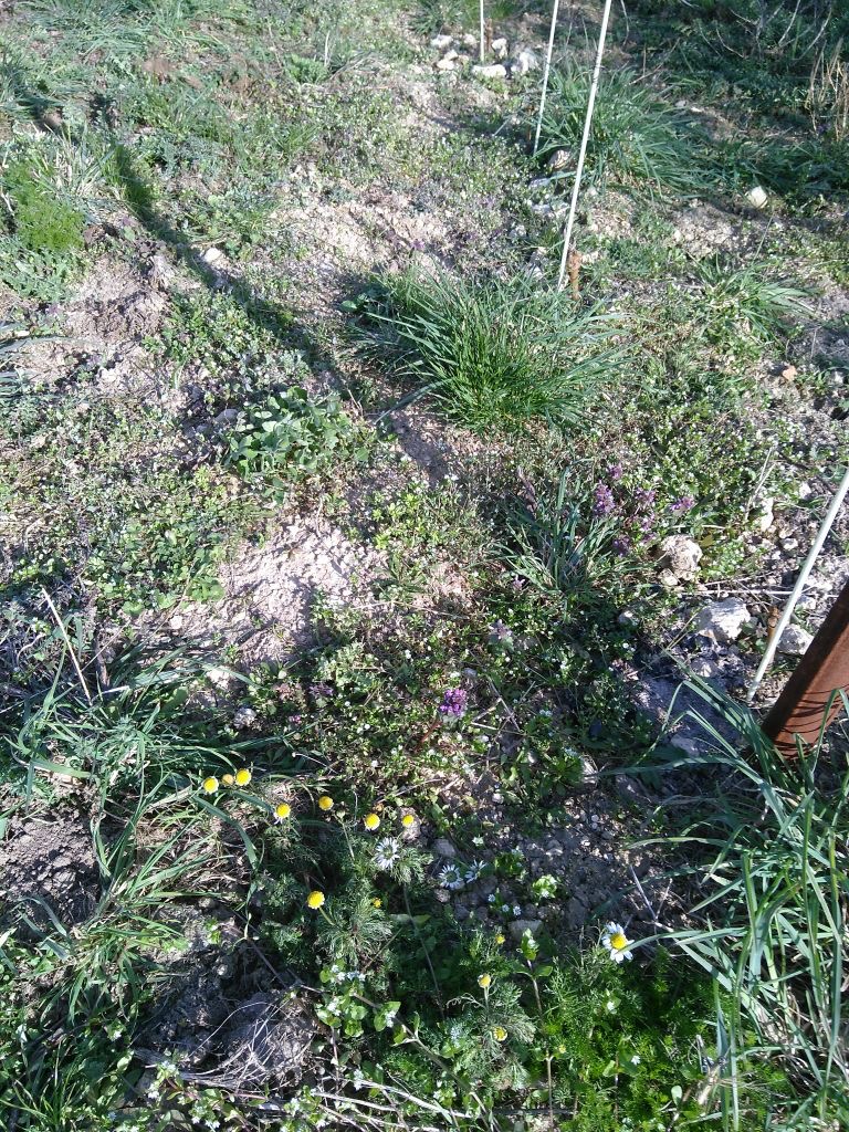 DieVegetation: Disteln hat es noch eine Menge, sonst bildet sich ab eine nette Grünschicht aus Miete, Taubnessel, Gräsern, Korbblütern, etwas Inkarnatklee usw. Dazu eine bisher reichhaltige Insektenwelt, diverse Wildbienen, Hummeln, Marienkäfer, Ohrenkneifer, Spinnen usw. Hier ist halt Platz für Alle!