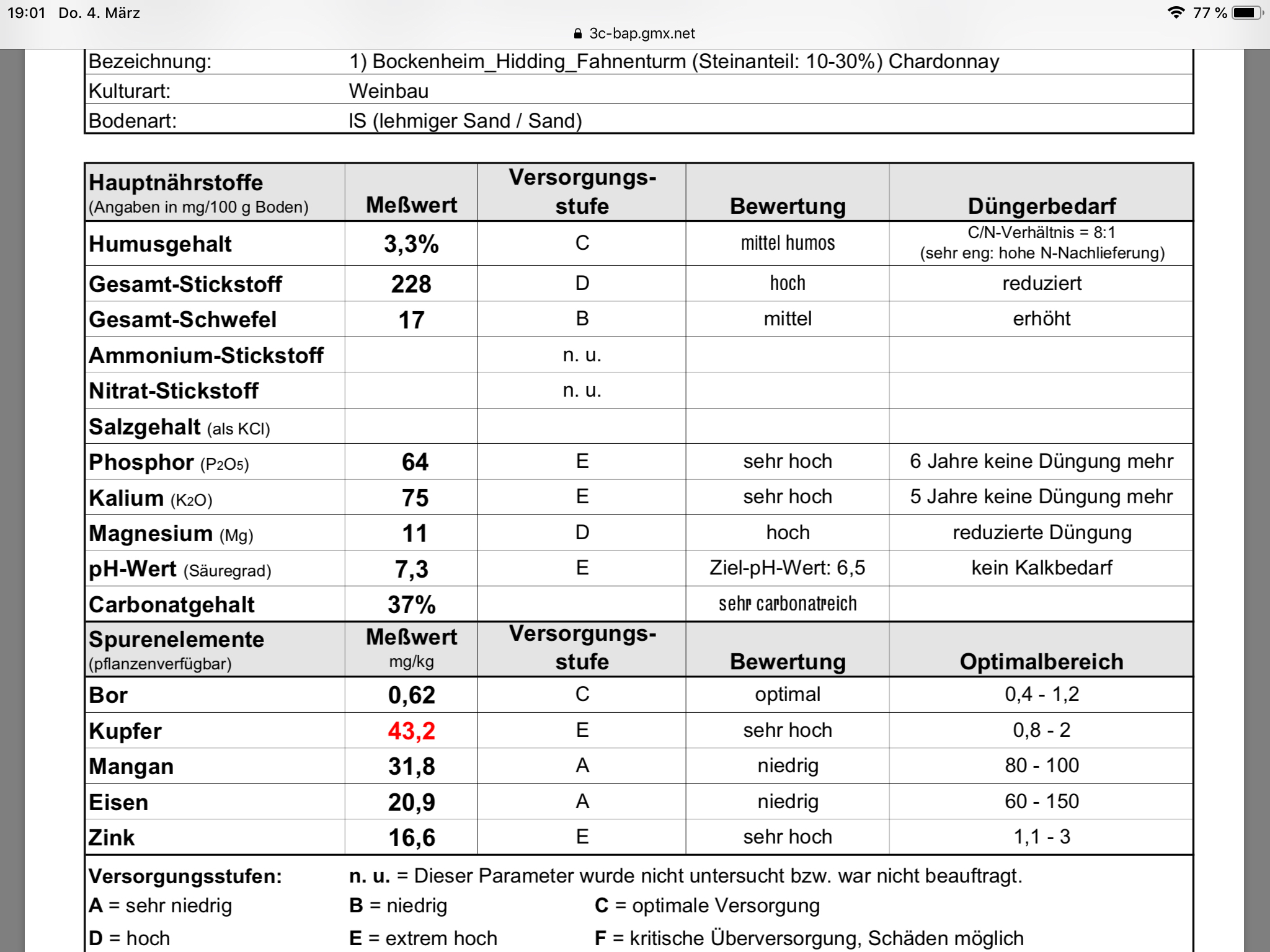 Das sind schon hohe Mengen Kupfer, vermutlich durch Kontamination aus früherer, weinbaulicher Nutzung. Der Ökotoxikologe in mir fragt sich, warum da überhaupt noch etwas lebt. So oder so, die Frage ist, wie die Proben analytisch vorbereitet wurde: wenn man zu harsch vorgeht, wird auch nicht akut bioverfügbarer Kupfer remobilisiert. Ohne diese Information wird ggf. der Anteil freien Kupfers überschätzt. Wie demnach sei, wichtig für mich ist zudem, dass genug N vorhanden ist. Den offensichtlichen Mängel an Eisen bzw. Mangan kann ich über Blattdünger einstellen. Da ich sowieso häufig Stärkungsmittel spritze, lässt sich ein Blattdünger gut einbauen ( so kombinierbar mit anderen Mitteln). Ohne ausreichend Wasser ist das aber auch alles egal ... das Liebig‘sche Faß lässt grüßen!