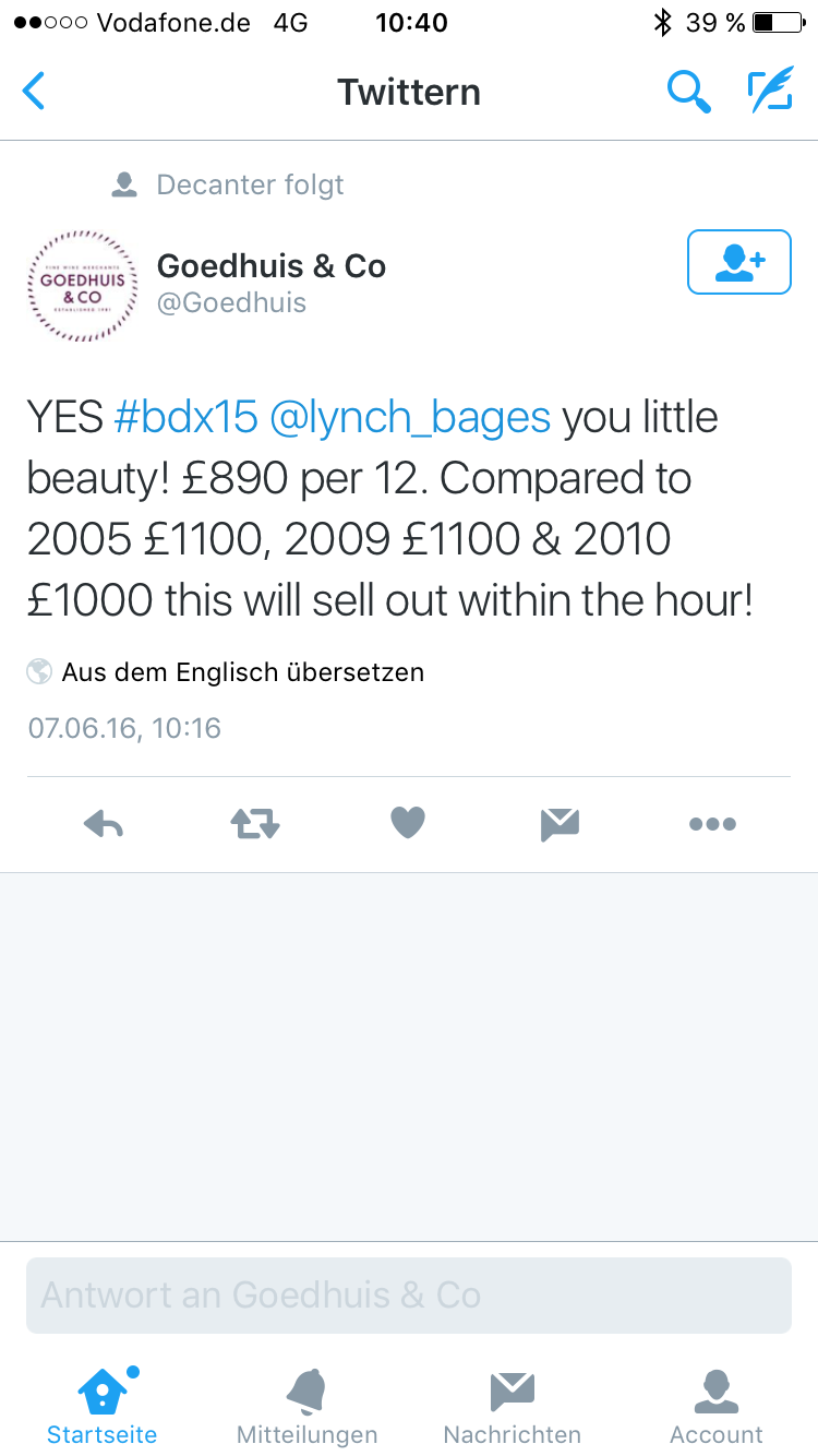 Etwa 115 Euro EVP. Gibt das die hierarchische Relation zu Pontet-Canet tatsächlich korrekt wiederMatthias Hilse hat geschrieben:Nun stimmt die Hierarchie in Pauillac wieder, denn Lynch Bages verschlingt € 84 pro Fl.