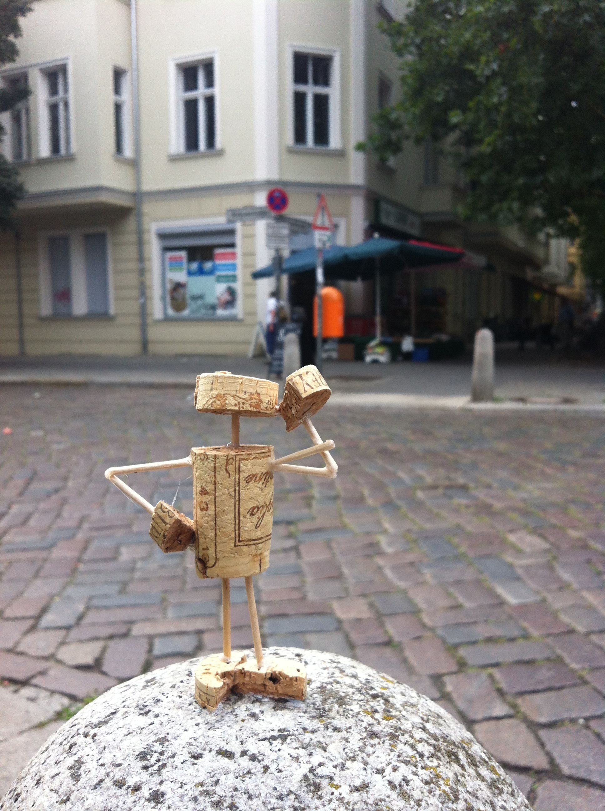 Ein Korkmänchen, von Unbekannt auf einem Poller angeklebt.