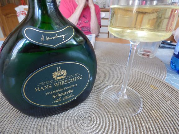 im Glas. Ein VdP-Ortswein also, und das für 8,80 €. Und hier stimmt mehr als nur der Preis, der Wein gefällt mir außerordentlich gut. 3,7 g Restzucker bei 7,4 g/l Säure sorgen bei mir am Gaumen für eine harmonische Balance von rassiger und doch dezenter Säure und fruchtiger Aromatik. Im jetzigen jungen Stadium sehr gut zu trinken, aber er hat genug Substanz um auch die nächsten 2-3 Jahre noch Freude zu machen. Eleganz ist hier wohl das treffende Stichwort. Säure, Mineralik, rieslingtypische Fruchtnoten, alles ist da und spielt bestens zusammen, da drängt nichts in den Vordergrund sondern harmoniert wie ein klassisches Kammer-Ensemble. Der Wein kommt definitiv auf die Nachkaufliste für den Alltagsgebrauch. Für Madame wird dann noch die halbtrockene Variante 2020 Iphöfer Riesling Kabinett hinzugefügt.