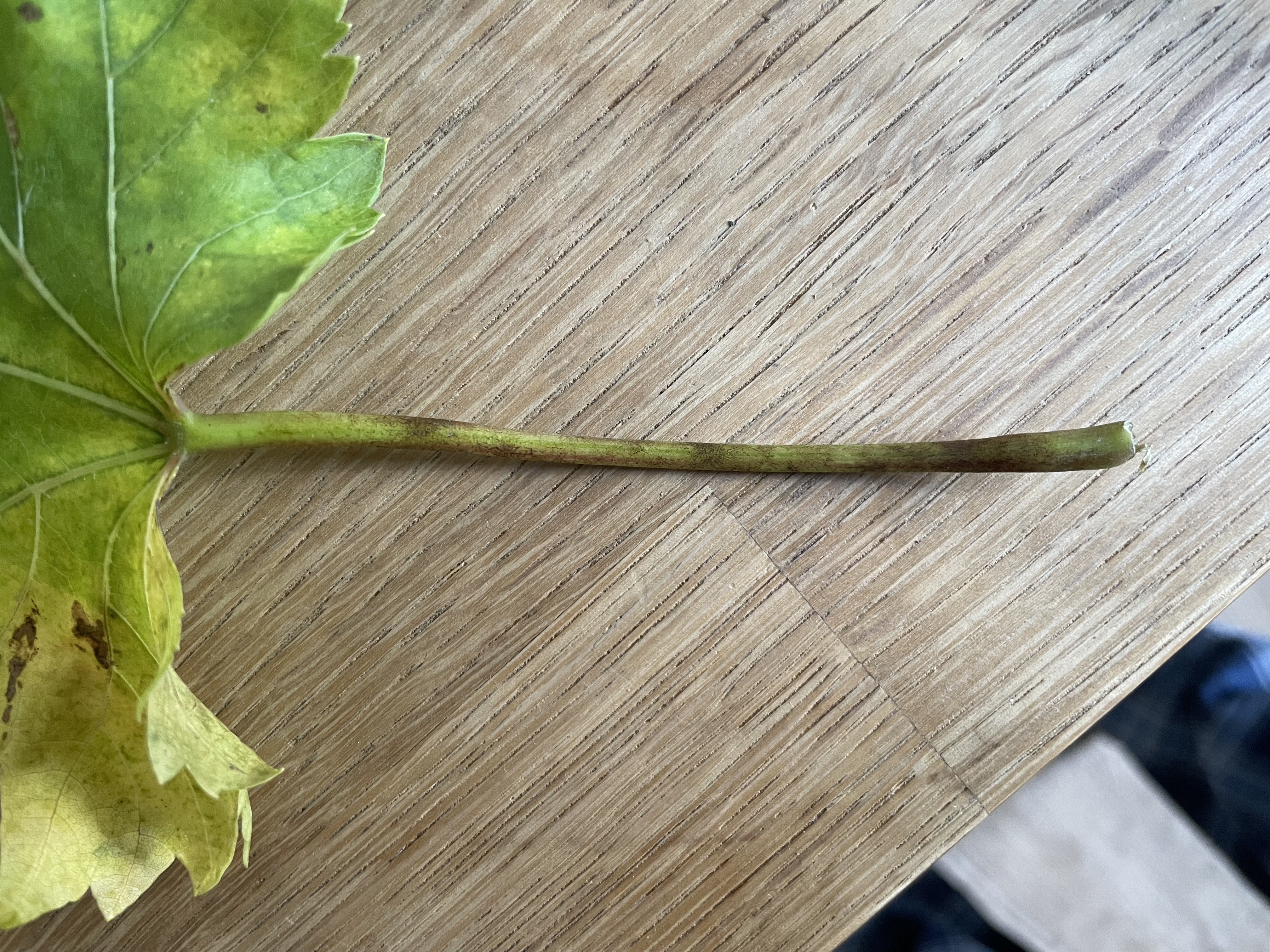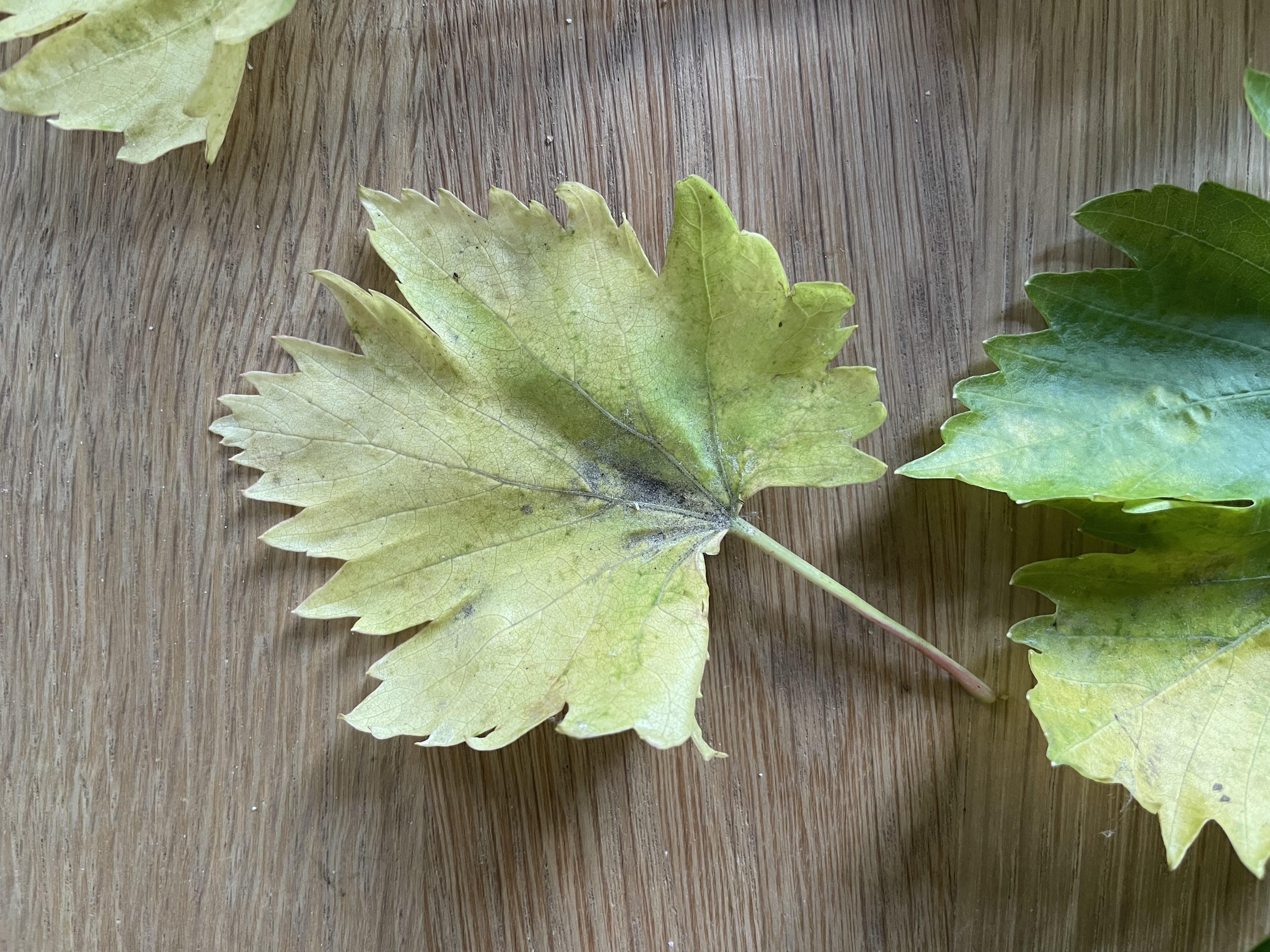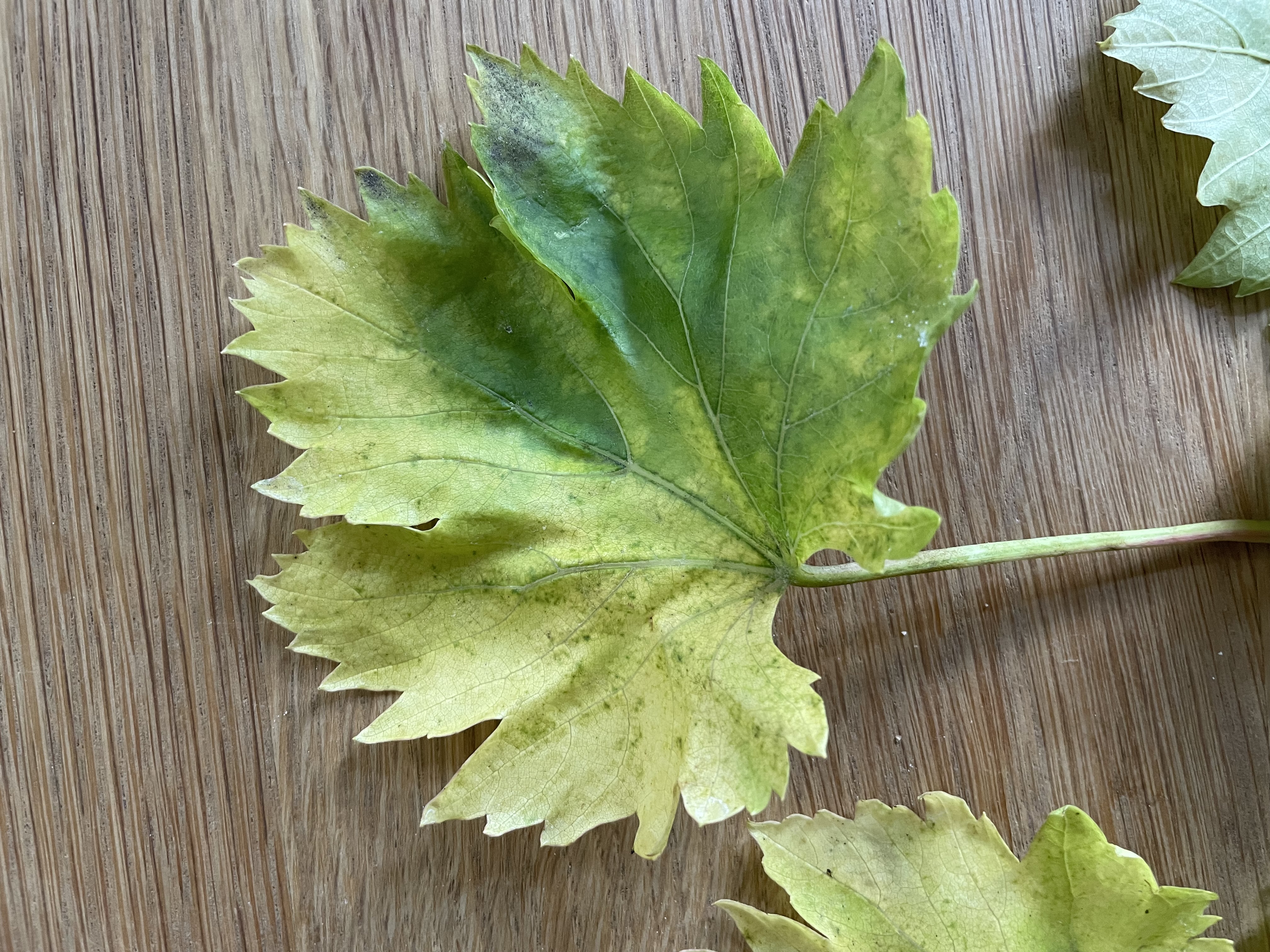 Ich kann mir vorstellen, dass es evtl. mehrere Baustellen gibt. Ein paar Mosaikflecken kann man sehen, die auf falschen Mehltau hindeuten. Die Farbe der Blätter ist aber etwas chlorotisch, was auf Standortprobleme, Unterversorgung, Viren uvm. hindeuten könnte. Aber vielleicht steht der Stock ja auch noch nicht so lange. Da gibt es schon mal Probleme, wenn er erst anwachsen muss.