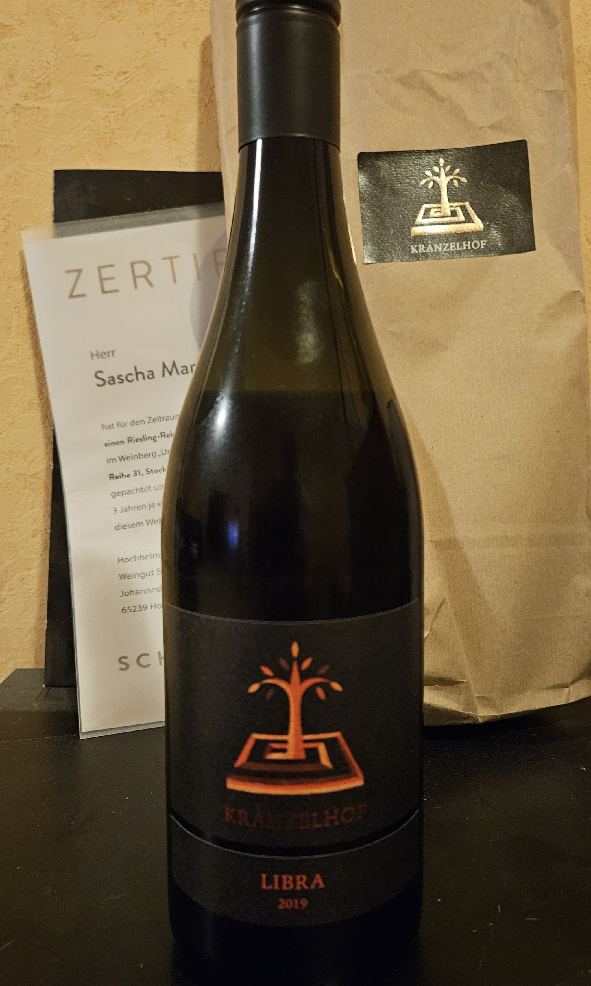 Die erste meiner Flaschen vom 2019er Pinot Nero Libra vom Kränzelhof mit 13,5 Vol%.