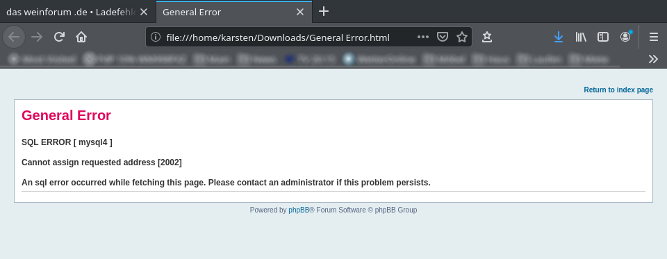Seit einigen Tagen (genau kann ich es nicht sagen) erhalte ich beim Versuch, das Forum zu erreichen, immer wieder eine Fehlermeldung mit dem Hinweis auf sql-Fehler. Wenn ich mich anmelden möchte, kann es sein, dass ich erst nach mehreren Fehlermeldungen rein komme - nach dem Drücken des Anmelden-Buttons kommt die Meldung wieder und auch hier muss ich es mehrfach versuchen, bis ich Erfolg habe.
