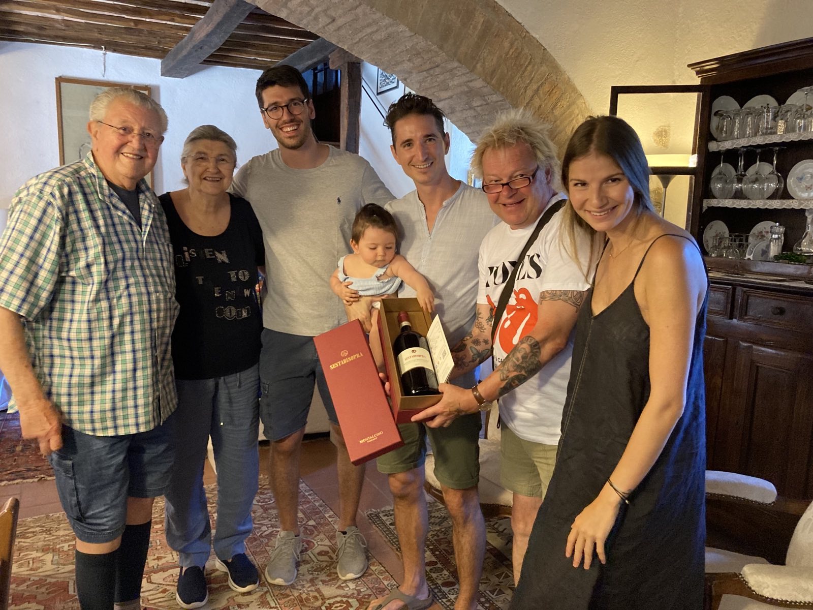 wunderbares Foto vom letztjährigen Besuch bei Ettore und Enrica, bei dem meine Enkeltochter Nr 3 CONSTANZE ihre erste Magnum-Flasche Brunello geschenkt bekam!