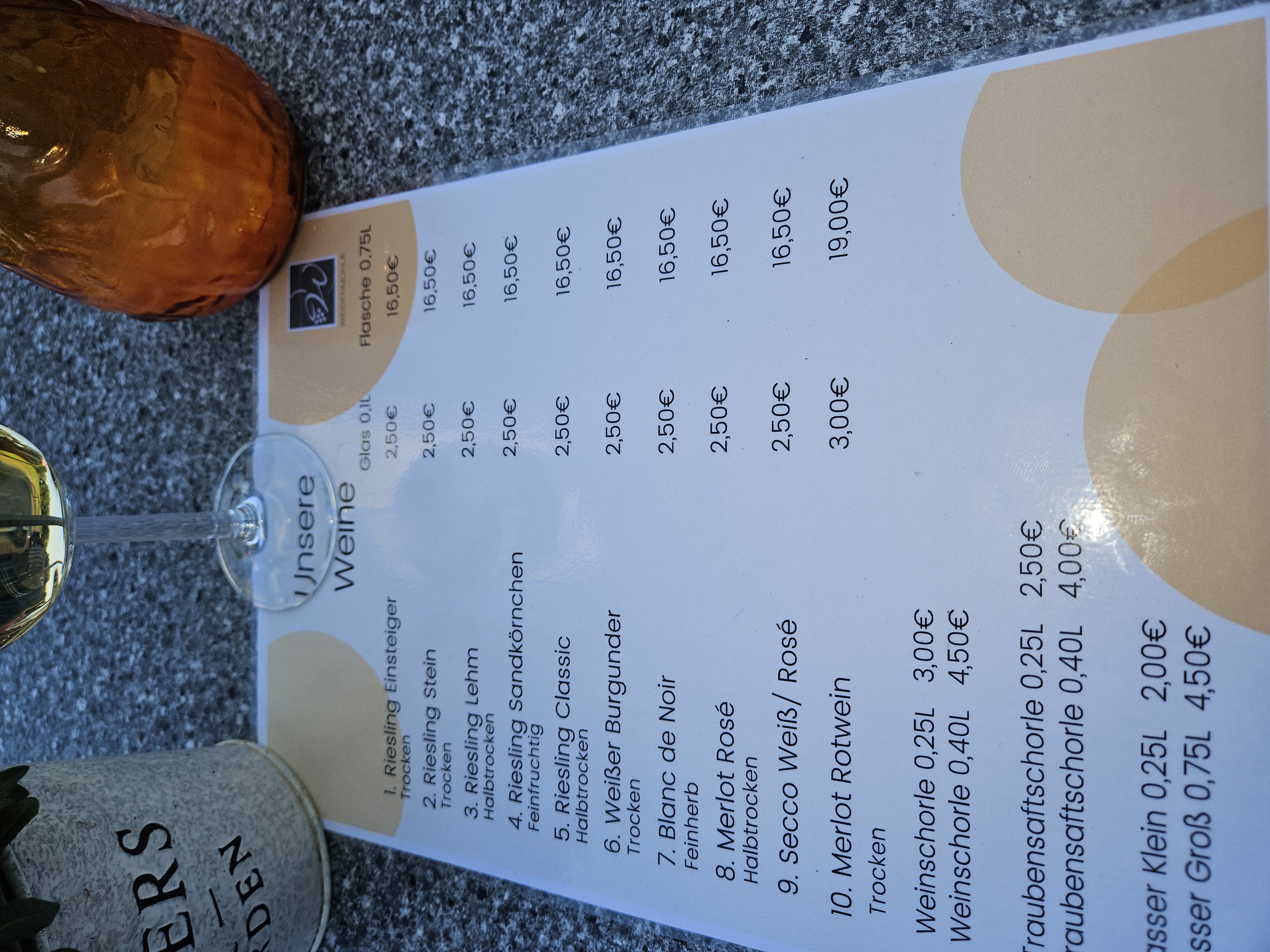 Nachdem ich von der Weidenmühle in Wicker (Allendorff) in den letzten Jahrzehnten eher enttäuscht als überzeugt war, zeichnet sich jetzt auch hier ein Silberstreif am Horizont ab. Der Junior ist jetzt der Chef im Ring und vor allem der Riesling Trocken "Stein" und der zusätzlich ausgeschenkte Wickerer Riesling Trocken "Mainwerk3" aus dem Jahrgang 2023 wussten durchaus zu überzeugen. Ok, der "Einsteiger" aus 2022 und der Weißburgunder waren eher flach, aber die beiden Anderen zeigten Potenzial, vor allem wenn man bedenkt, dass auf der Weinpreisliste kein Wein mehr als EUR 8 kostet👍