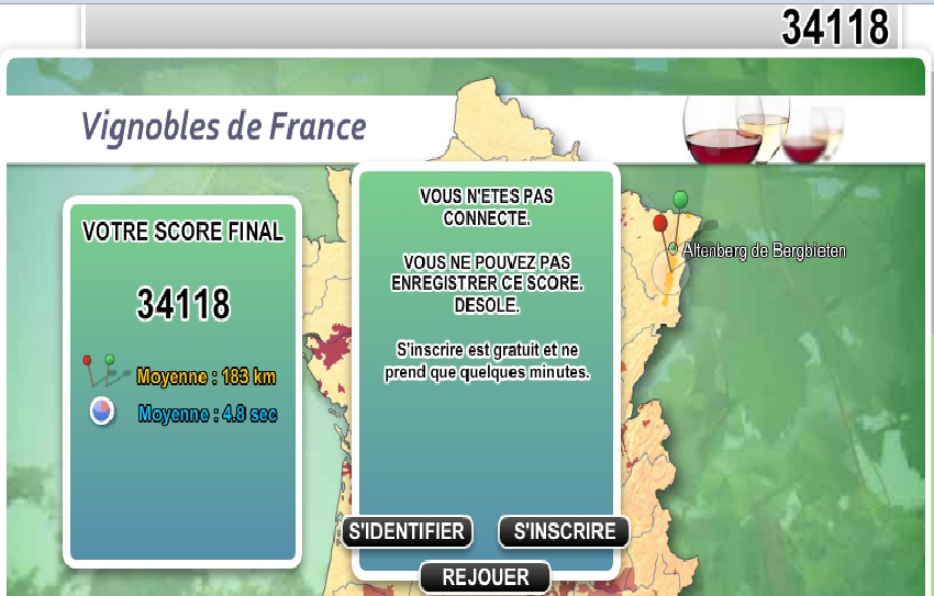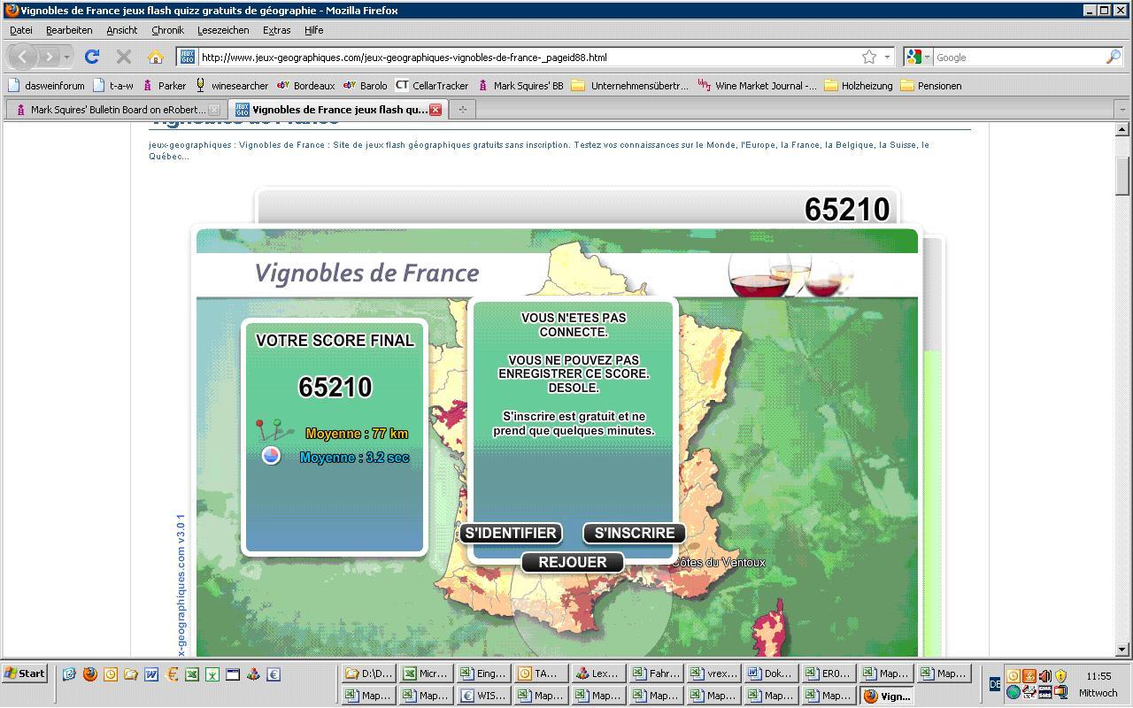 hab das Ende der Mittagspause noch zu zwei Versuchen genutzt und bei einem noch einmal Glück gehabt. Lustig finde ich, dass mir völlig unbekannte AOCs, die ich dann wild irgendwo ins Languedoc stecke, fast grundsätzlich entweder in der Savoie, im Jura oder irgendwo im Zentralmassiv auftauchen :D.