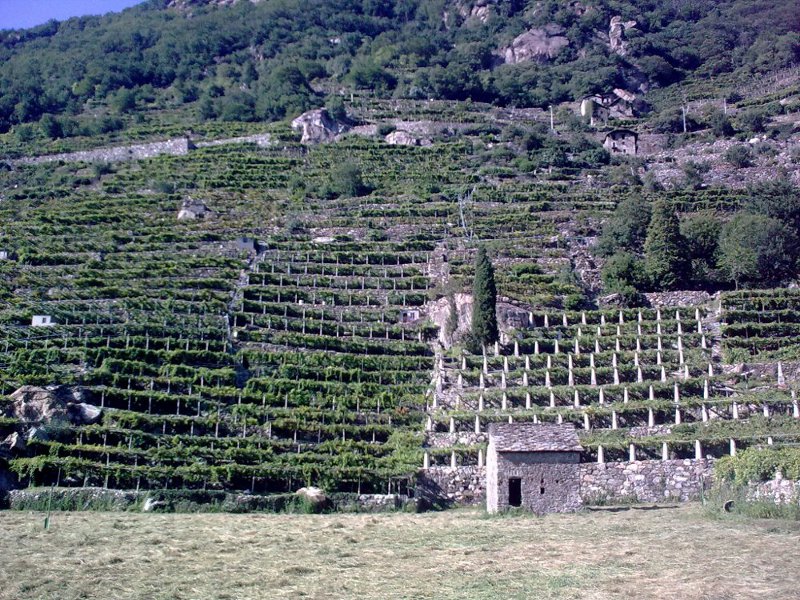 1. Das Tal der Dora Baltea zwischen Saint-Vincent und Ivrea (Aostatal und Provinz Turin), wo Nebbiolo in Pergolen an Steilhängen angebaut wird und