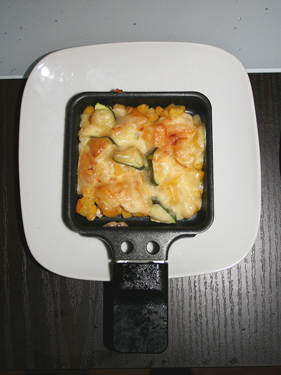 Raclette-Pfännchen mit Paprika, Zuchini und Mais