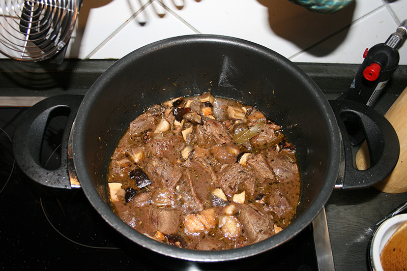 Die Fleischstücken wasche ich kurz ab - sie dürfen ruhig etwas blutig bleiben, denn das Blut gibt eine hervoragende Würze - und gebe es in einen großen Topf, dessen Boden mit bis auf den Rauchpunkt erhitzten Rapsöl bedeckt ist. Unter Wenden von allen Seiten braun anbraten. Wichtig: zum Anbraten kein Olivenöl verwenden, denn das bildet bei hoher Hitze toxische Stoffe! Anschließend Olivenöl zur Veredelung auf das Fleisch geben und mit Wasser ablöschen. Mit Salz, Schwarzem Pfeffer aus der Mühle, Rosmarin, Thymian, Oregano, Majoran und Lorbeerblatt abwürzen und ca. 75 min im gesschlossenen Topf köcheln lassen. Die letzten 20 min. werden die Waldpilze dazugegeben. Ideal sind natürlich immer frische Pilze, denn die haben ein kräftigers Aroma als eingefrorene oder getrocknete Pilze. Leider standen mir nur gefrorene zur Verfügung. Außerdem gebe ich noch einen Teelöffel Kakao dazu. Kakao veredelt das gericht zum einem geschmacklich, indem er mehr Aromenfülle verleiht und zum anderen optisch, indem es dem Gericht eine appetitliche dunkelbraune Farbe verleiht. Zum Schluß noch einen Schuß Sahne rein, umrühren - fertig. Dazu gab es Thüringer Klöße - die mag ich am liebsten dazu. Den Teig mache ich nicht selbst, denn den nicht unbeträchtlichen Aufwand kann man sich sparen, da es Fertigteig von sehr guter Qualität zu kaufen gibt.