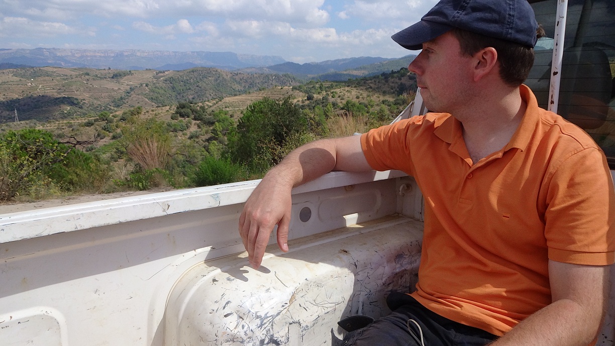 dann ging es mit pickup truck in die weinberge von mas d'en gil. zuerst in den macabeu weinberg (http://de.wikipedia.org/wiki/Macabeo). besonders interessant war die rote farbe des bodens - also eher nicht der schwarze licorella schiefer des priorats.
