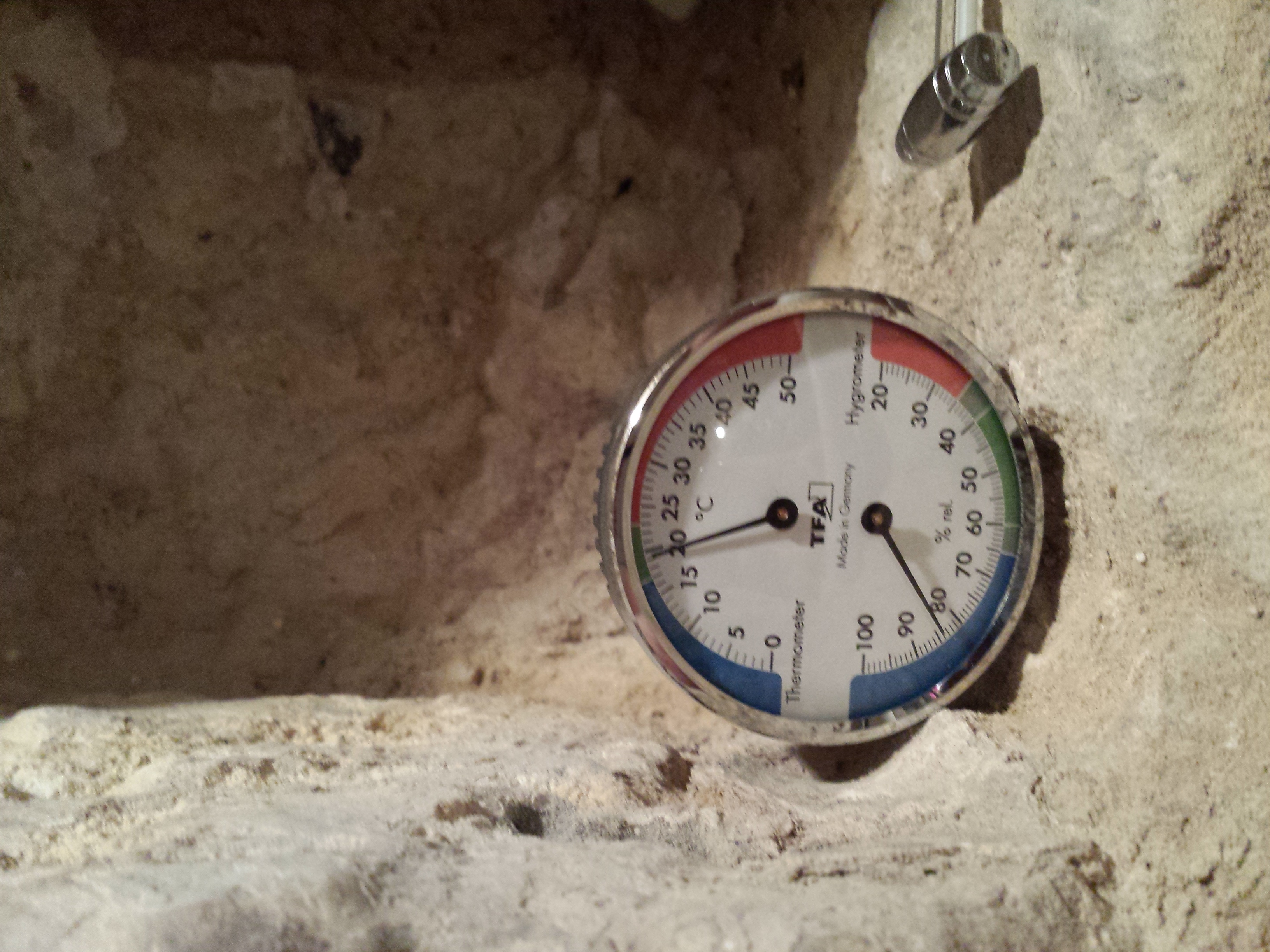 Wie man sieht ist es ein Naturstein-Gewölbekeller alter, pfälzischer Bauart (vermutlich ca. 100 Jahre alt). Die unteren Außenwände sind gerade im unteren Bereich feucht, bei Starkregen z.T. Auch tropfnass. Das dürfte besser werden, wenn wir dereinst die Terrasse drainieren.