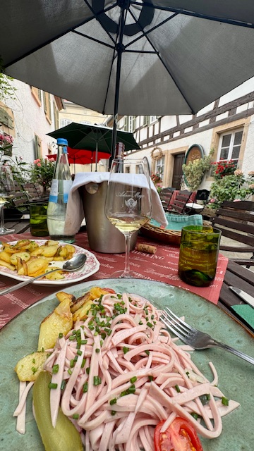 Neulich in Forst a.d.W. Ein paar Wanderkilometer zuvor bei der Verkostung bei Bürklin-Wolf in Wachenheim hatten wir dort nach einem Tip für eine kleine Mahlzeit am frühen Nachmittag gefragt. Es gab dann Wurstsalat mit Bratkartoffeln im Weingut Acham-Magin. Da gibt’s natürlich Pfälzer Riesling dazu. Ein leicht gereiftes Pechstein GG geht natürlich auch