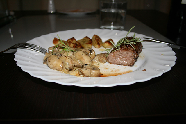 Als Beilage gab’s gebackene Kartoffelecken und Champignons.