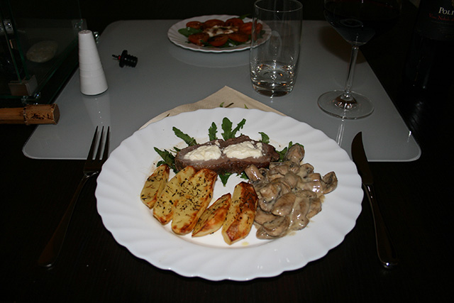 Für die Champignons in Olivenöl im Topf eine zerkleinerte Zwiebel andünsten, geschnittene Pilze rein, mit Salz, Pfeffer und Kräutern der Provence würzen und bei geschlossenem Deckel 20 min dünsten. Dann etwas klein gewürfelten Feta dazugeben, warten bis er geschmolzen ist und zum Schluß einen Schluck Sahne rein – fertig.