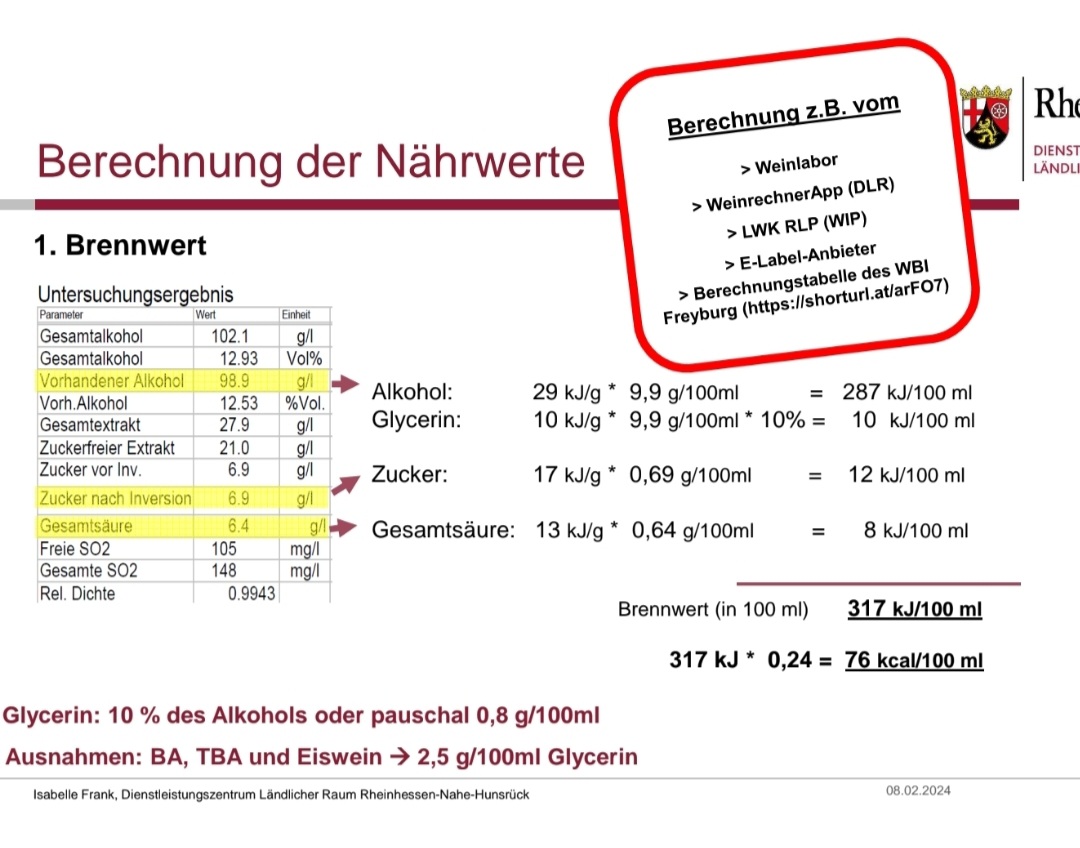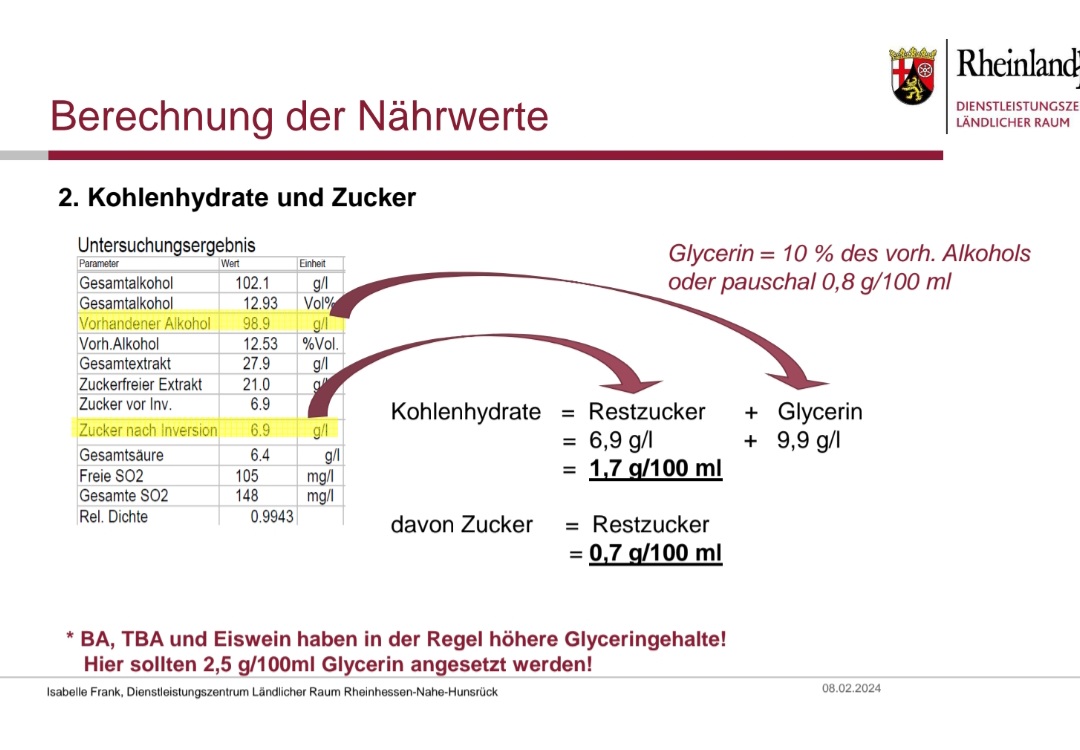 ich fürchte, du hast das ein bisschen missverstanden: Im zweiten Bild ist erkennbar, dass der Alkohol nur für die Abschätzung des Glycerins verwendet wird (die getrennte Bestimmung des Glycerins wäre zu aufwändig) und i.A. mit 10% des Alkoholwerts angenommen wird. Dann wird Glycerin (das kein Kohlenhydrat ieS ist, aber ein Zuckeralkohol) zum "echten" Zucker addiert und ergibt die Gesamtkohlenhydrate, also 17 g/l bzw. 1,7 g/100ml. Wenn der Alkohol auch enthalten wäre, müsste der Wert ja ca. 11,7g/100 ml sein.