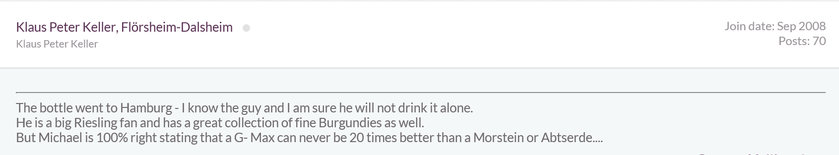 hochwertige Lebens-bzw. Genussmittel sind für mich seit jeher Teil meiner Lebensphilosophie. Kaviar oder Wagyu-Rind müssen dabei nicht sein, aber 2 oder 3 Flaschen G-Max pro Jahr möchte ich schon genießen. Der ist für mich bei allem Respekt vor den trocknen Weinen anderer großartiger Winzer von Nahe, Pfalz und Rheinhessen immer das Tüpfelchen auf dem "i" des Weingenusses. Die Beschaffung des G-Max ist seit dem Jahrgang 2011 an den Bezug der (auch optisch sehr attraktiven) Kellerkiste gebunden. Eine 3-Liter Flasche für über 5000,00€ käme für mich nicht in Frage, eher schon 4 Kellerkisten zum fast gleichen Preis. Dennoch meine Gratulation zum tollen Versteigerungserfolg, der für das Ansehen des trockenen deutschen Weines im In-und Ausland durchaus Schubwirkung haben könnte.