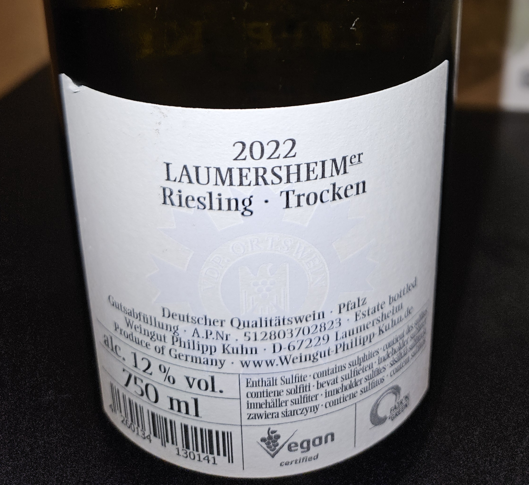 2022er Laumersheimer Riesling "vom Kalksteinfels" mit 12 Vol% von Philipp Kuhn aus besagtem Laumersheim.