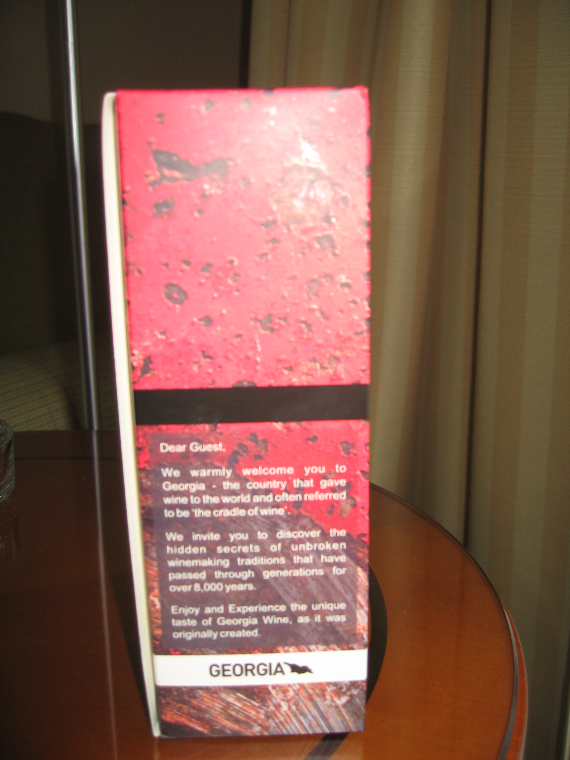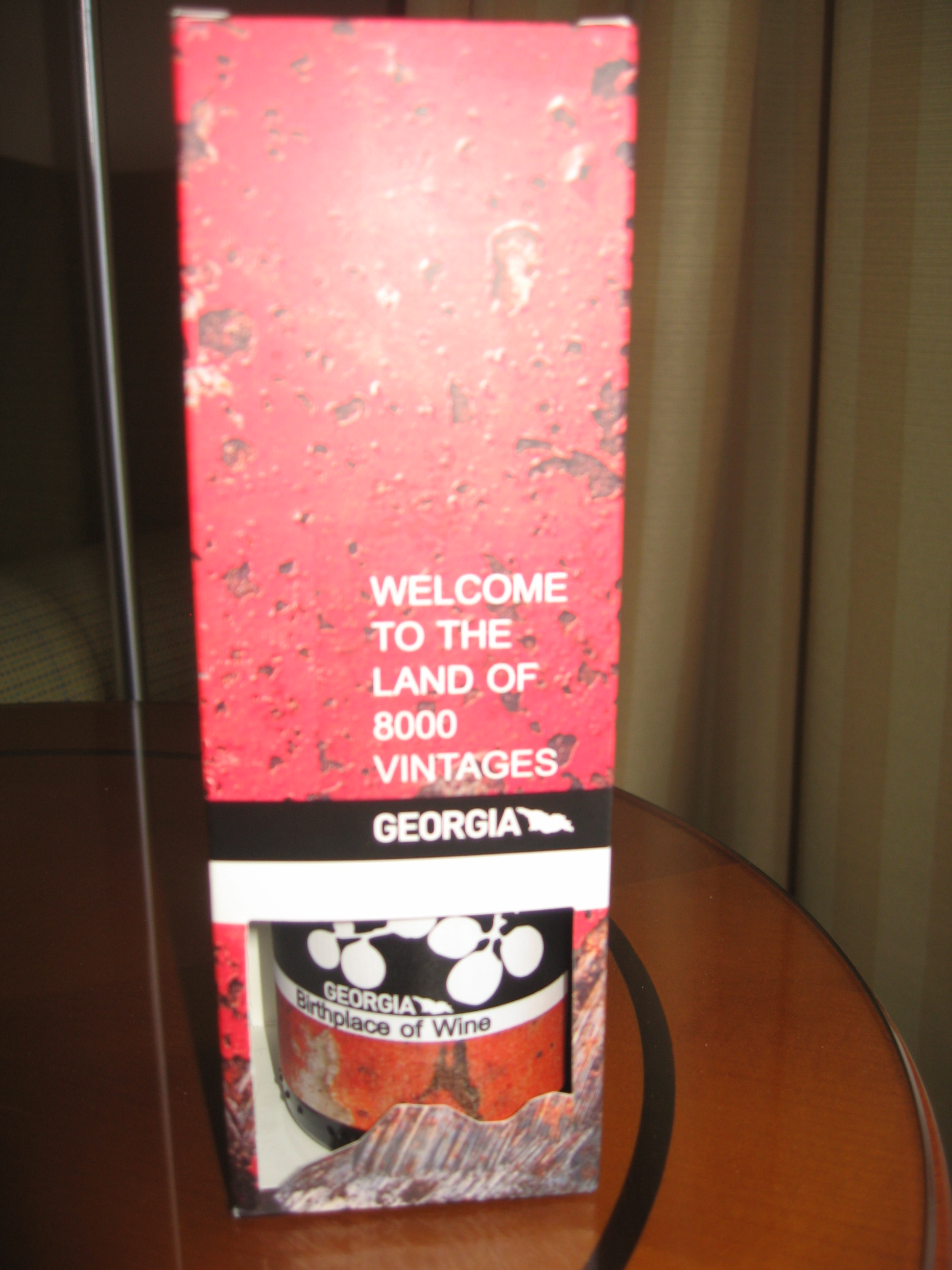 heute morgen bei der passkontrolle am tifliser flughafen wie jeder einreisende folgende kleine flasche rotwein bekommen. auf dem etikett steht nur: "Georgia. Birthplace of Wine"